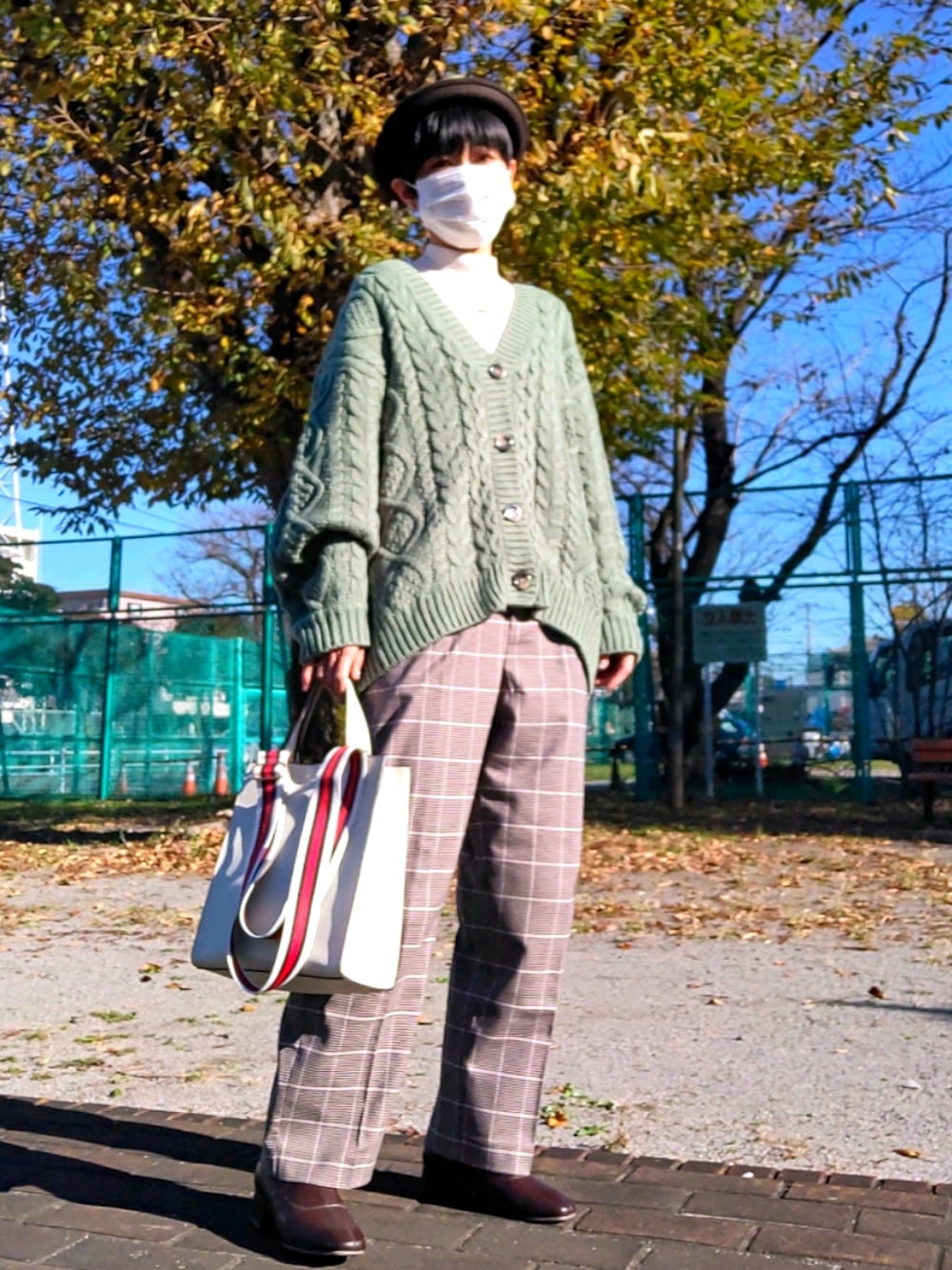 カラーニット、グリーン🍀 今日も晴天! 秋に映えるくすみグリーンのケーブルカーデ。 ブラウンのチェックパンツと合わせてアースカラーコーデ。 日差しが心地よい🤗🍁