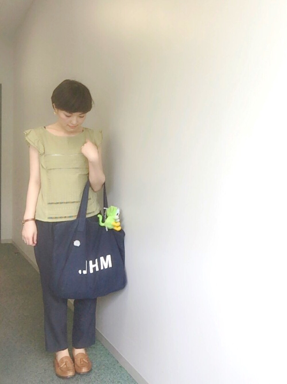 こんばんは( ¨̮ ) zozotownのsaleでゲットしたトップス登場( *´꒳`* ) この緑色がきれいな色で形も可愛くて後ろのタッセルも可愛くて一目惚れしました( ¨̮ )💕 あとはこのネイビーのパンツも初お披露目かもしれないです!とっても履きやすくて色も少しくすんでるところがお気に入りです☺️ そして久しぶりのHARUTAさん( ˙˘˙ ) この靴もお気に入り〜!! お気に入りだらけ。笑 何度もごめんなさい:( ;´꒳`;): そしてなんといっても靴、時計、カバン含め、3色でまとめられたところがテンション上がってます(*´˘`*)♡ 長くなりました😂 いいね!コメント、SAVEお待ちしております♪