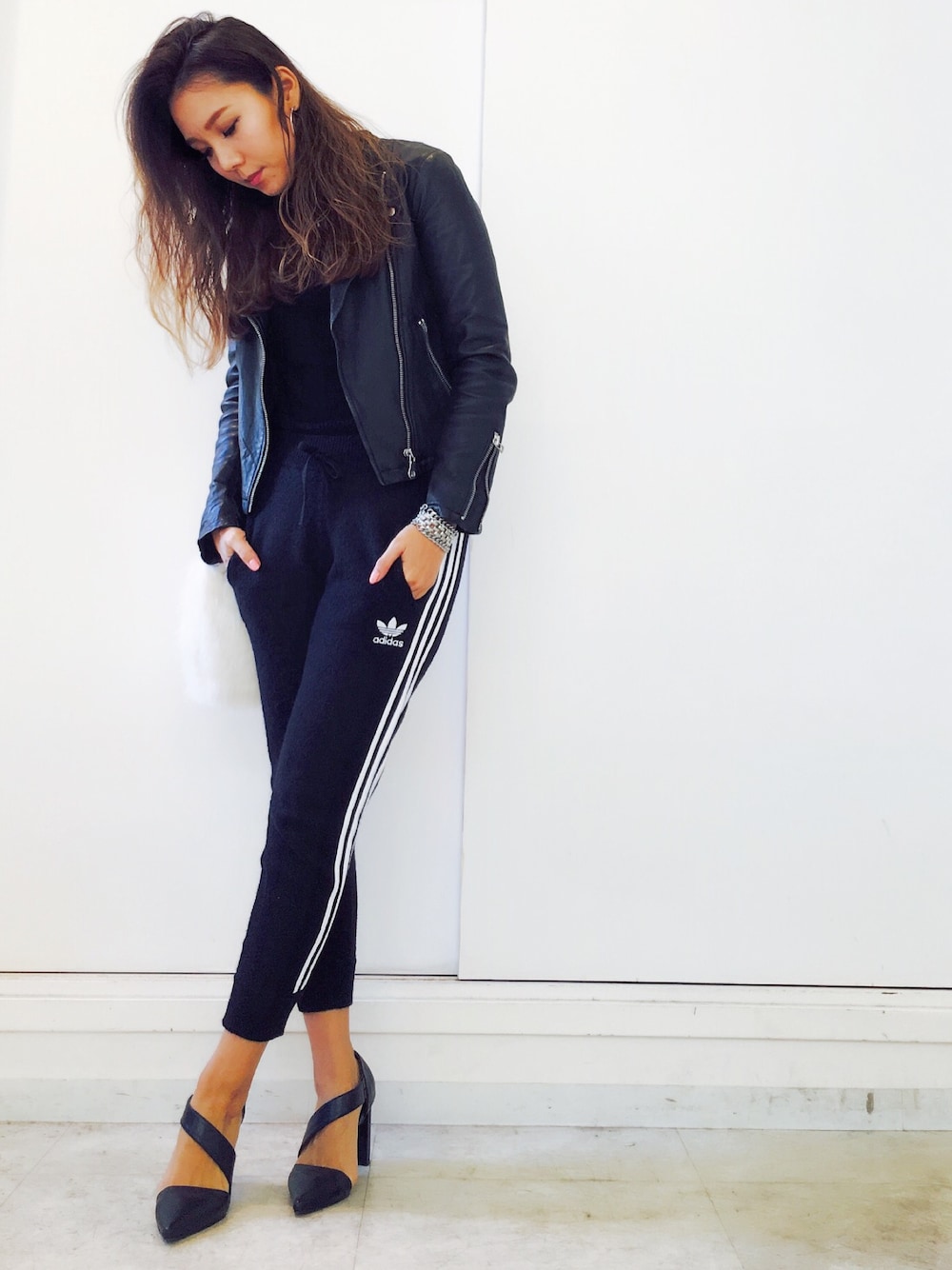 一目惚れのadidasoriginalsのパンツ ニットパンツなんて珍しい♪ メンズライクなブラックコーデの時は ヒールで女性らしさを出すのがお決まり♡