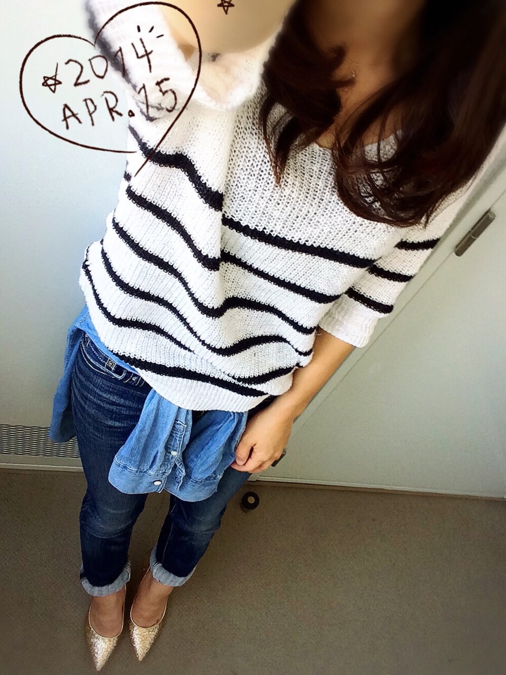 ボーダー×デニム 一番好きな組み合わせ☻ 昨日に引き続き腰巻きSTYLE♡ トップス: E hyphen デニムシャツ: H&M パンツ: moussy パンプス: ungrid