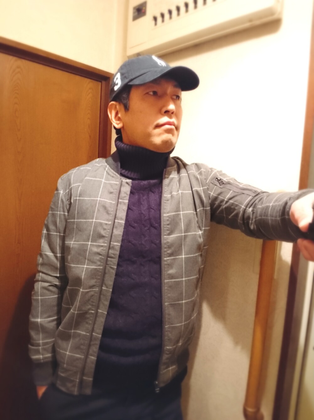 真冬の無彩色シンプルコーデ。 いわゆるフライトジャケット生地ではない、ウインドウペン柄のMA-1タイプのタイトアウターをチョイス 帽子はハンチングを避け、カーブキャップで全体が重いイメージにならないようにしました。