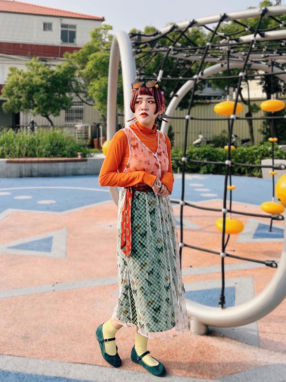 グリーン系のスカートを着用したレディースの秋コーディネートの1枚目の写真