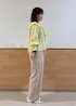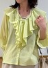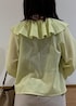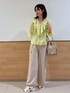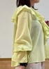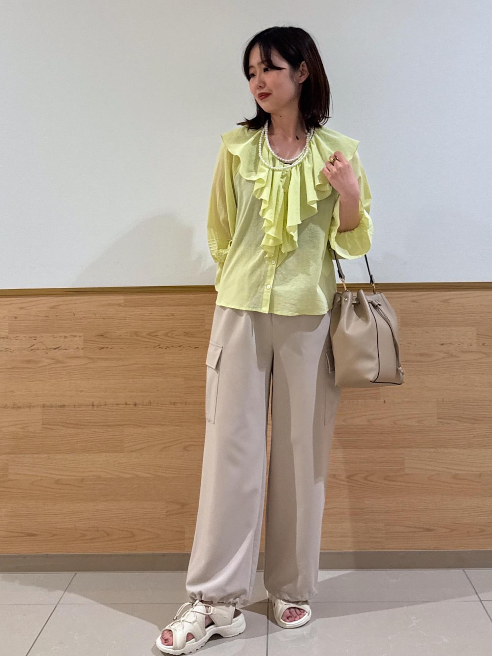 イエローのフリルブラウスに、カーゴパンツを合わせたきれいめ感のあるカジュアルコーデです。 フリルブラウスを主役にしたかたったので、他のアイテムは白やベージュにまとめてみました。