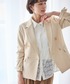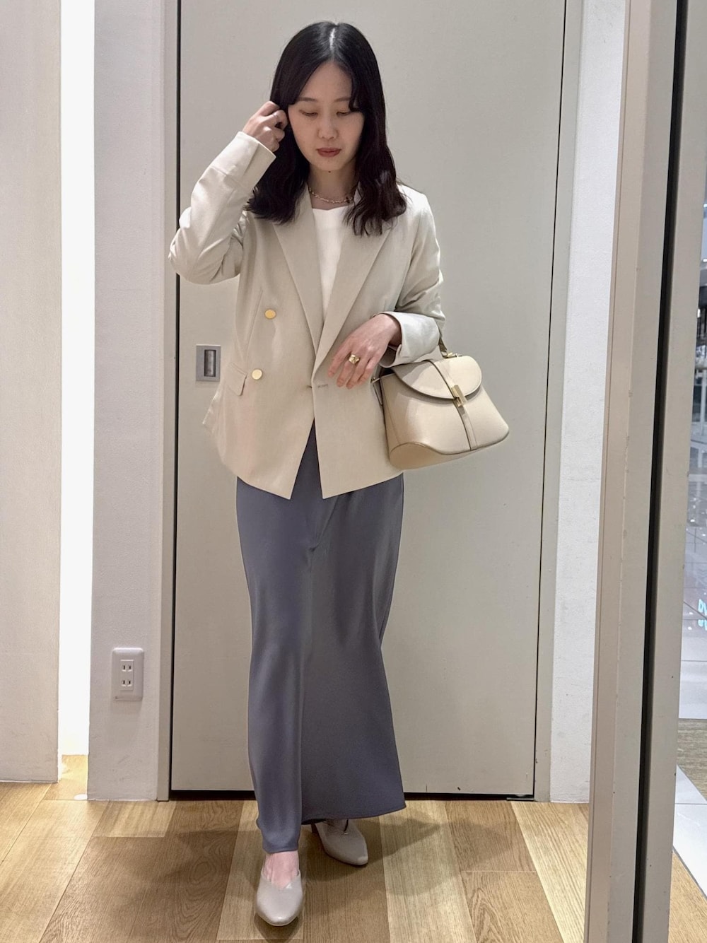 春夏に着やすいカナパ素材の金ボタンジャケットが今年も早速登場。 ベージュのジャケットに、きれい見えするサテンスカートを合わせてフェミニンなきれいめコーデに。 小物もベージュでまとめて柔らかい印象に。