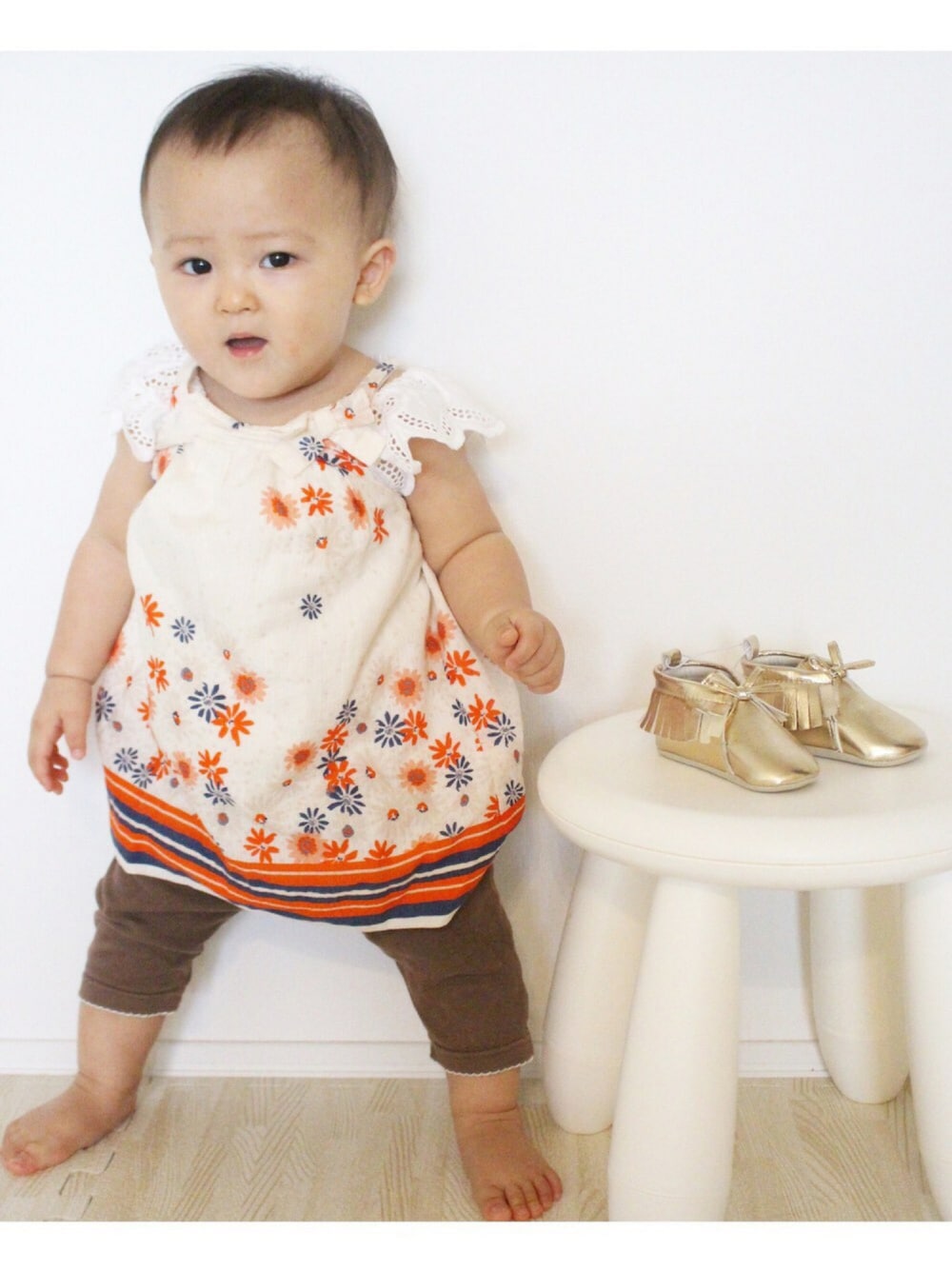 こんにちは(*^^*) 朝寝してたらパパが大きい声で喋って起きちゃって、 超絶不機嫌な娘です(笑) いいね、ありがとうございます(*^^*) 今日は、夏も終わりなので、 おそらく来年は完全サイズアウトで着られないであろう ベビーギャップのワンピース! 肌寒いので、ブラウンパンツと組み合わせ❤︎ 一目惚れして購入したオールドネイビーの ゴールドシューズ、すでに入らず😂 諦めていたけど、横置き撮影(笑) たまたまコーデに合いそうだったので(笑) 一昨日から、拍手を覚えたあーさん! 1つ1つ成長頑張ってるねo(^▽^)o