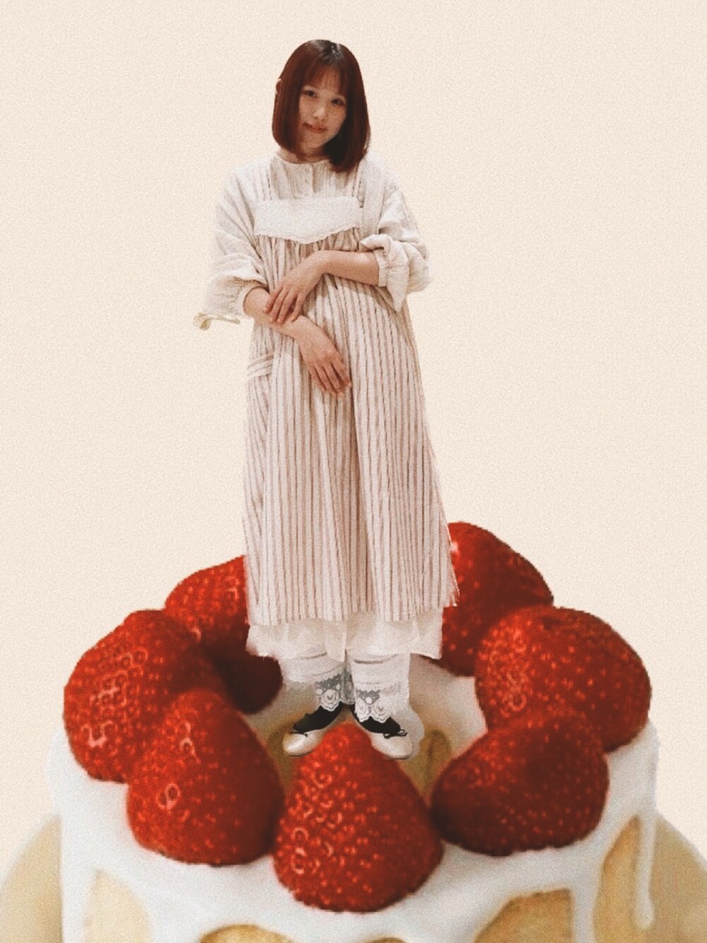 ご覧頂きありがとうございます🌷 エプロンとワンピースの個性的な組み合わせで 一味違うコーデはいかがですか? 赤と生成でショートケーキ🍰
