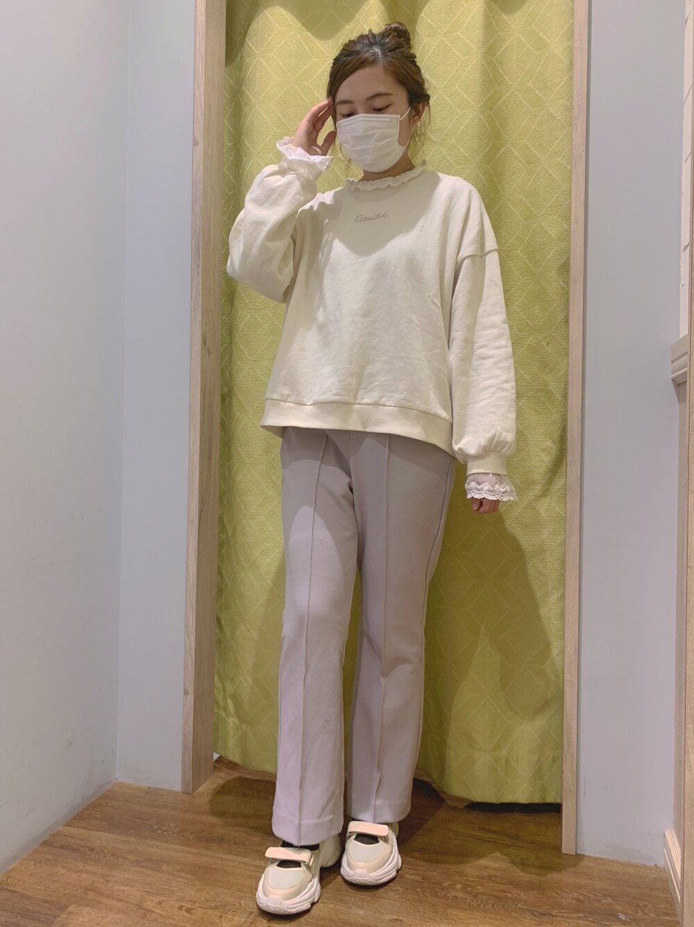 レース付きプルオーバーはなんといま1499円! アルファベットの刺繍あり、めっちゃ可愛い😆 センターフレアパンツ 1999円! 春に向けて、とてもピッタリなカラー!