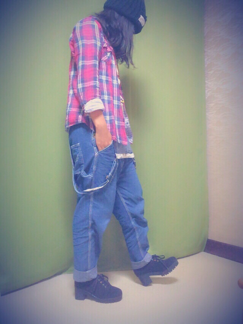 今日のコーデは、オーバーオールを上まで着ないでわざとおろしました! オーバーオールがずり落ちてしまわないように腰にベルトを付けて最大限の腰パンに!! 今日は、赤チェックの差し色を入れて見ました☺✨