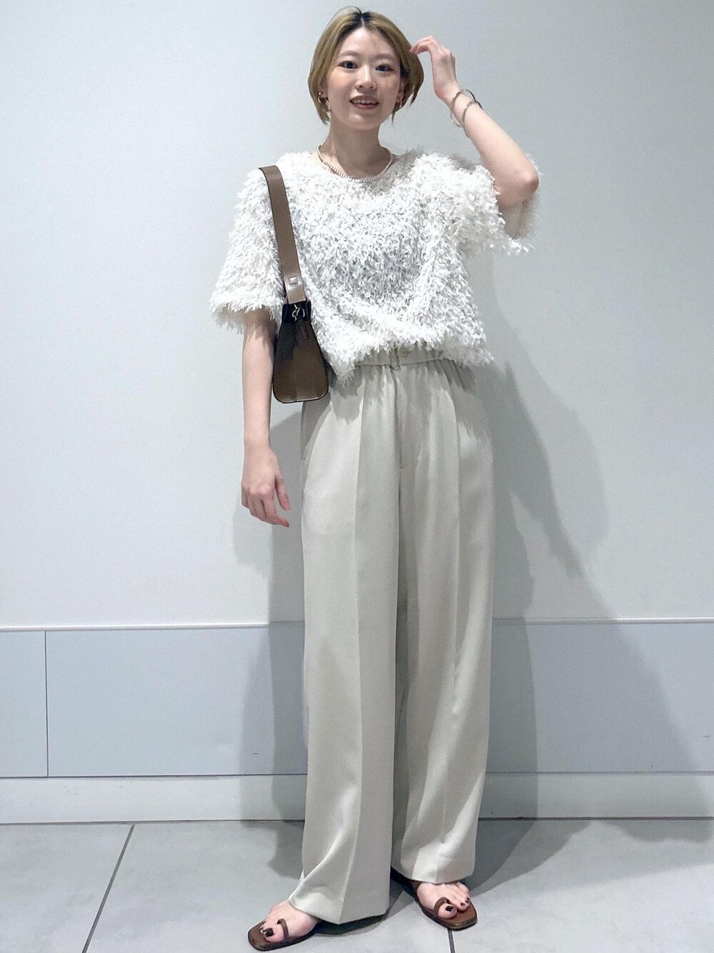 チュールのフワフワが特徴的な、デザイントップスが入荷しました◎ シンプルなコーディネートのアクセントにピッタリなアイテム。 半袖なので、今の暑い時期から秋口にかけてご愛用頂けるデザインです! 今回はリラックスパンツと合わせてオールホワイトコーデでまとめました。 ややカジュアルなアイテム同士の合わせだったので、小物はレザーで綺麗め要素をプラス。 デートコーデにもぴったりですね♫