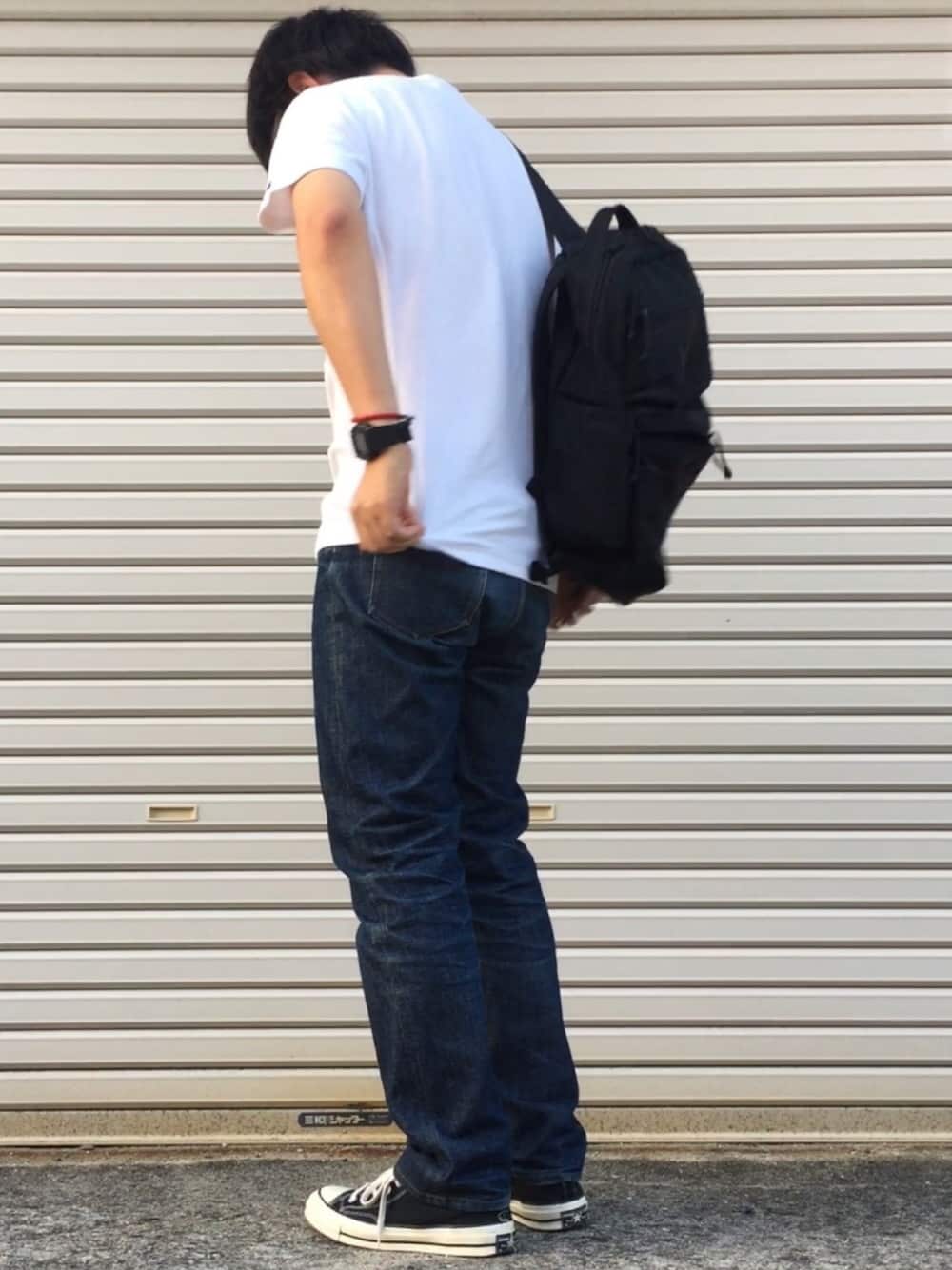 5年目にしてようやくA.P.Cレスキューにハチノスが出てきましたコーデです お盆期間に1軍服総選挙を行いました このTシャツとデニムは2軍行きです 1軍昇格予定だったドライボーンズのボウリングシャツが見つかりませんでした悲しい