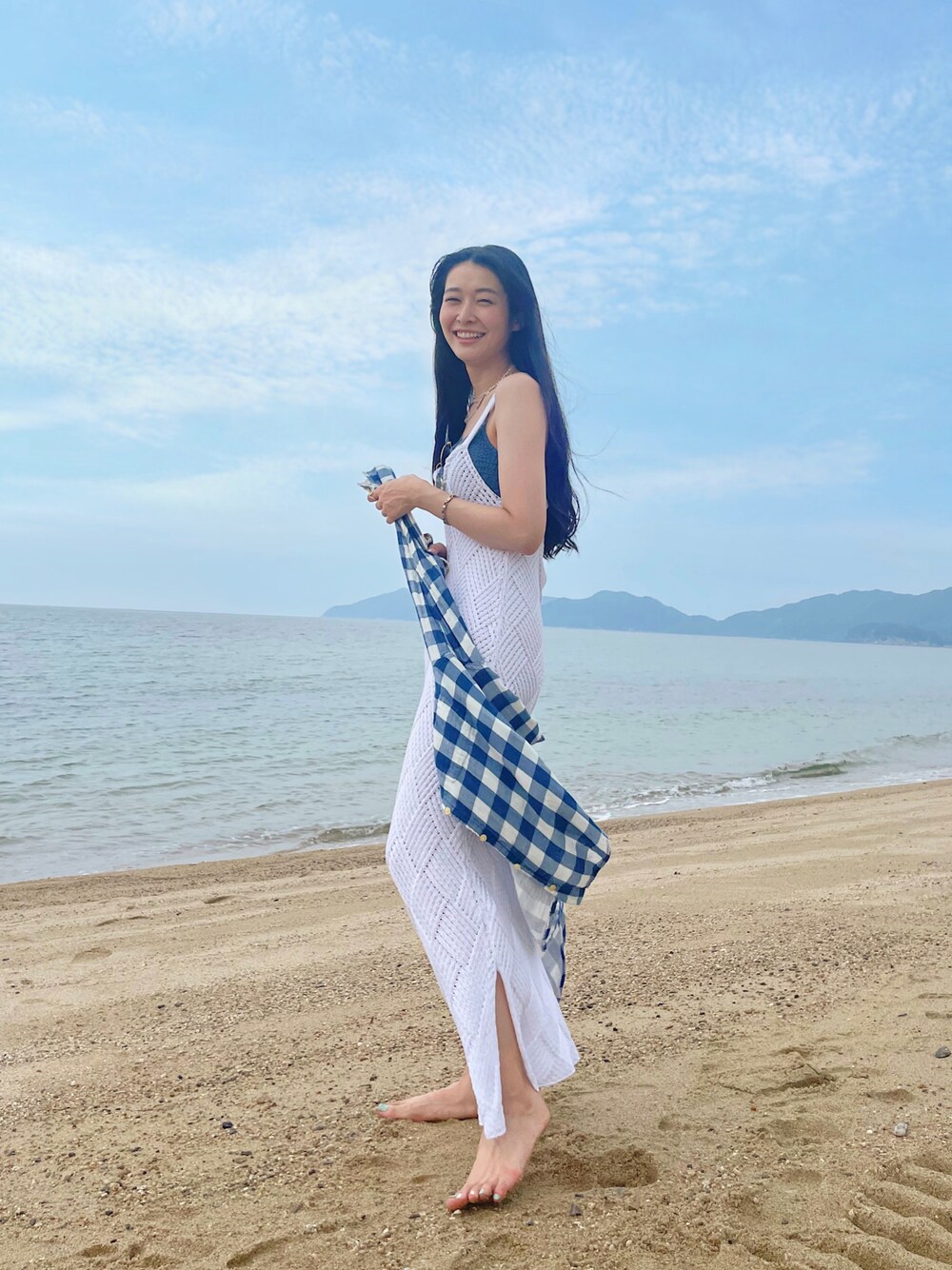 ACCLのバスケットニットロングワンピース🐚 街ではTシャツやパンツを合わせて着てもかわいいし リゾートや海だとサラッと着られていい感じです🙆🏻♀️ 海には入らなかったけどインナーに水着合わせたよ👙