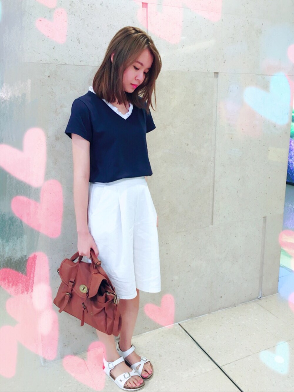 這次的特色是在衣服上的領口😋 深藍tee 拼 白褲 又是淨色的配撘。 襯埋涼鞋 有夏天的感覺呢✌🏻️😀😽