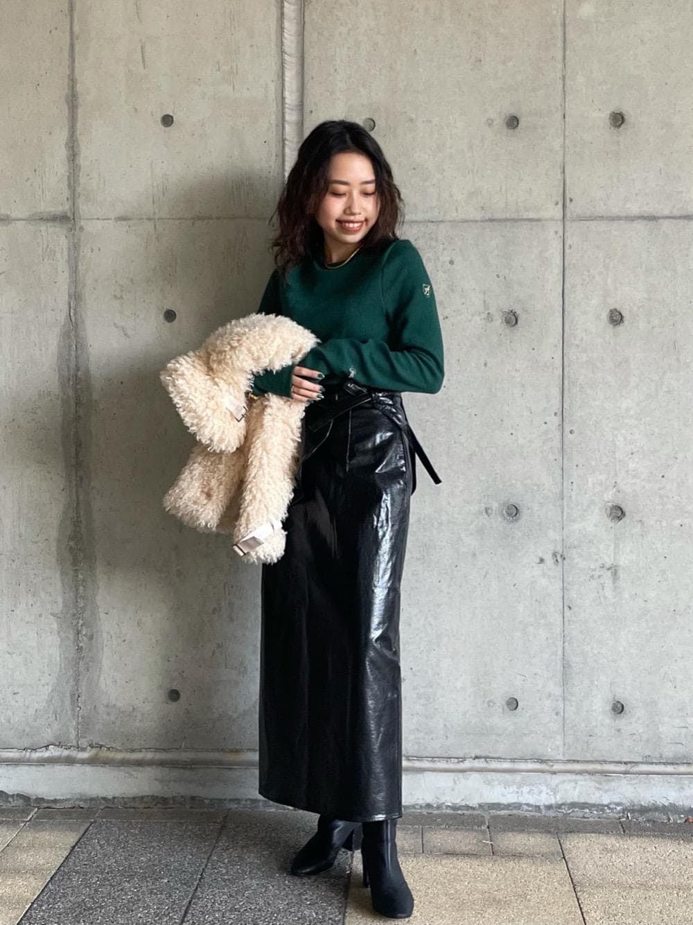 ショート丈で着膨れしにくいファージャケット😆 ホリデーコレクションでコーディネートを組んでみました🎄 レザーのスカートもペプラムがついてるので強い印象になりすぎずとてもかわいいです🙆♀️