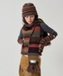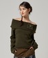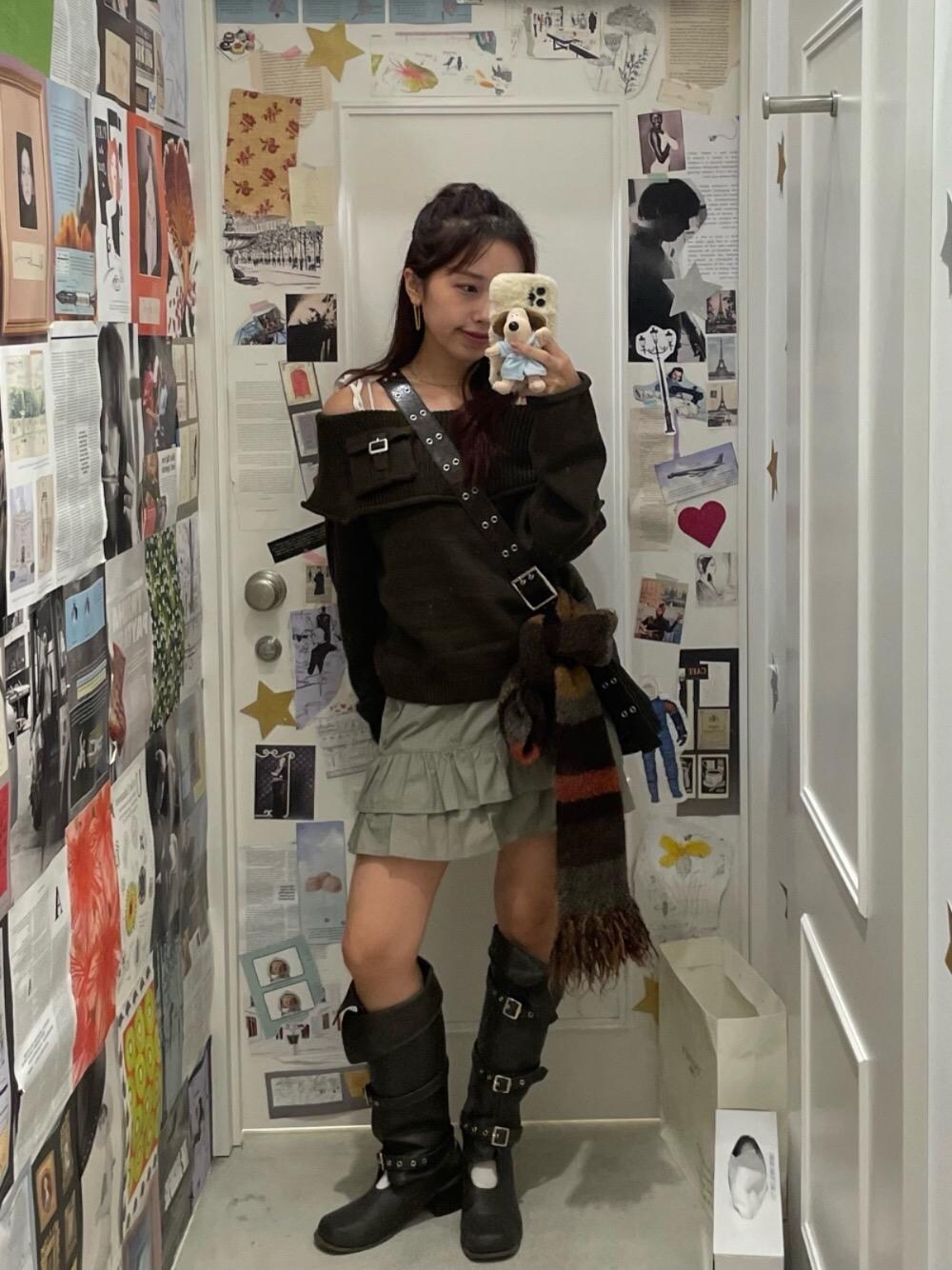 ジャストアイテムのオフショルニット! カーキでまとめて、ボーダーマフラーをリボンにしてバッグに結びアクセントにしました🤎 マフラー使わない時このようにつけて、外で首に巻くのがおすすめです!