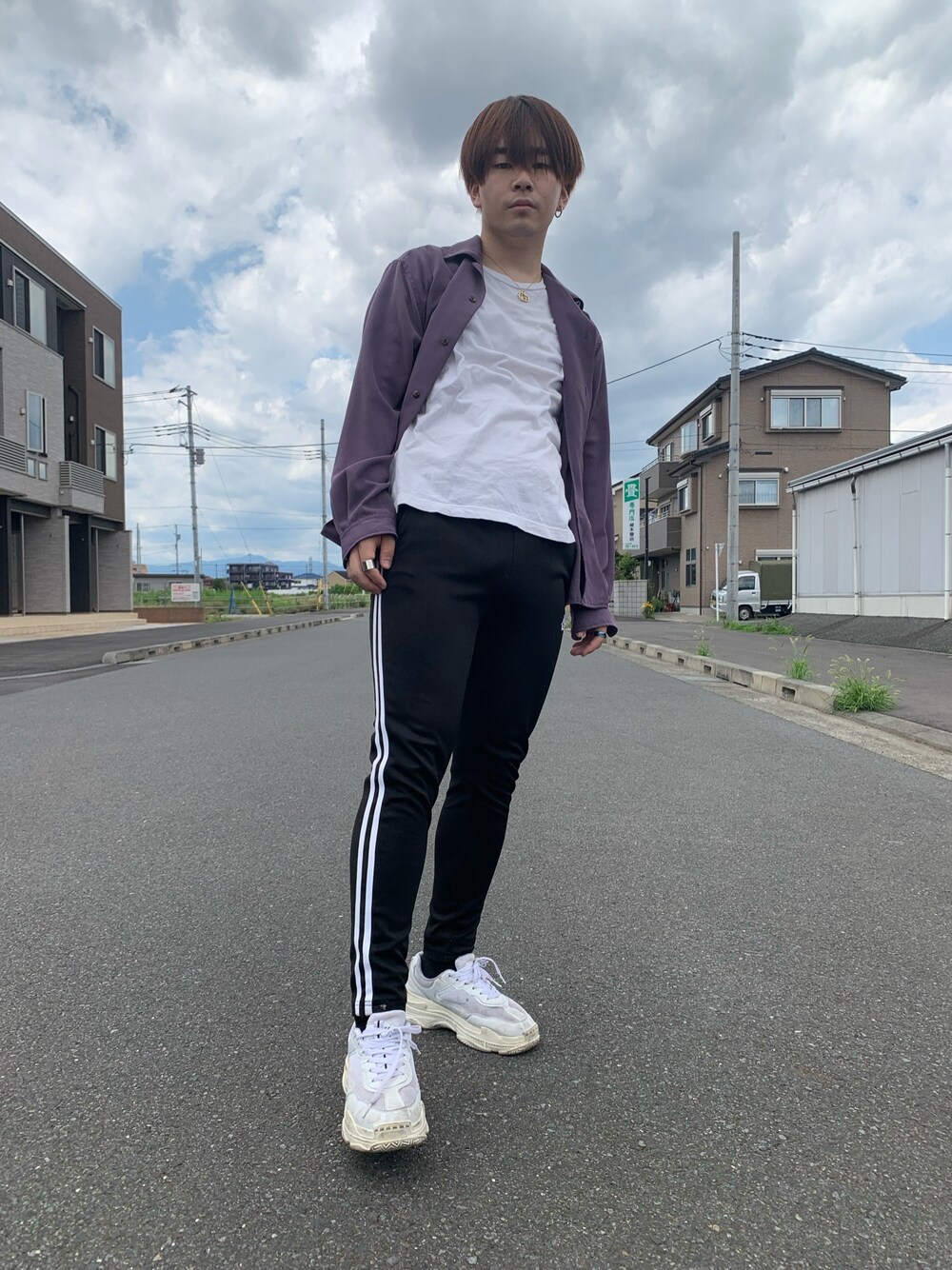 パープル系のジャケット/アウター、ホワイト系のTシャツ/カットソー、ブラック系のその他パンツを着用したメンズの夏コーディネートの1枚目の写真