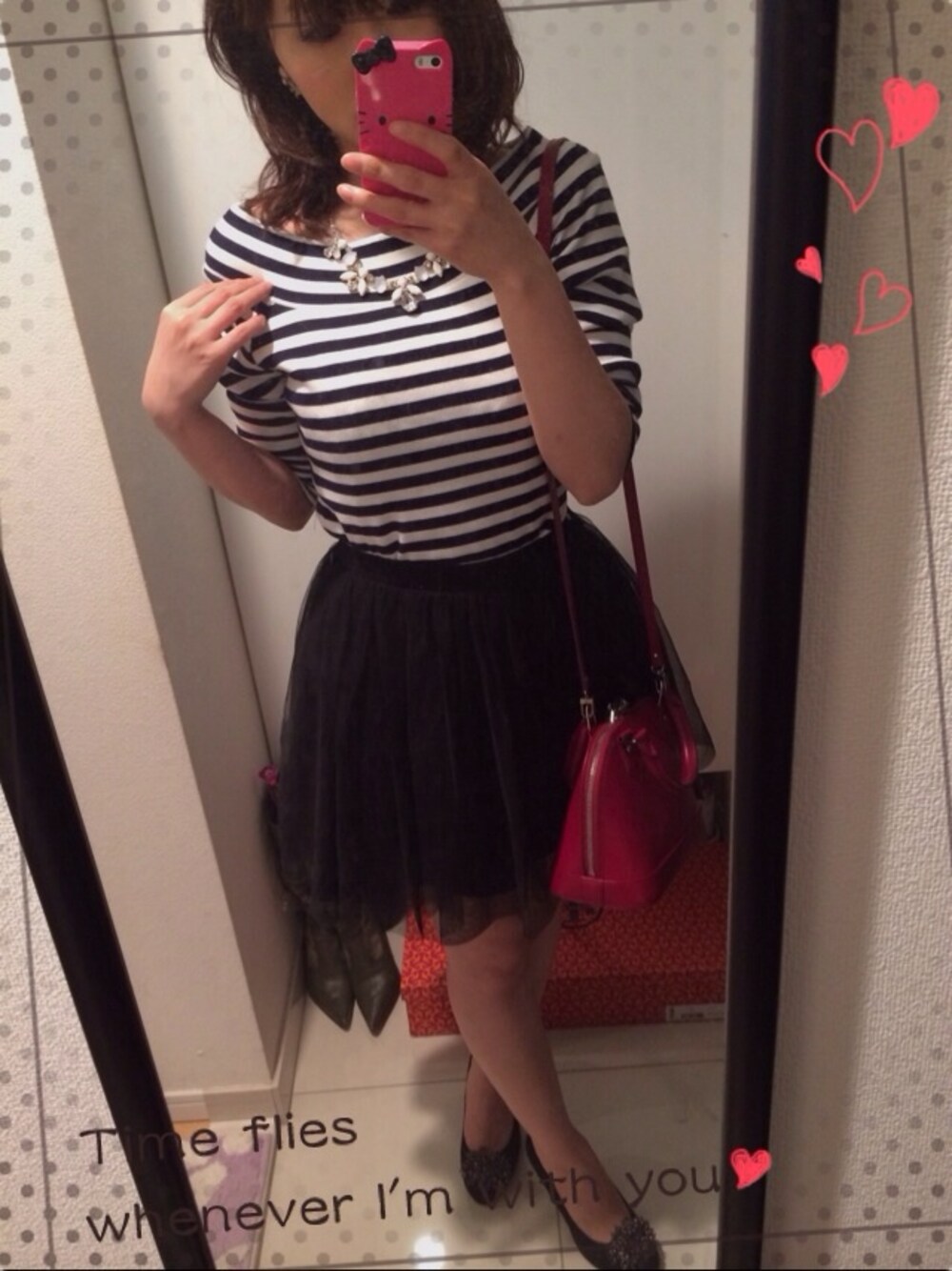 MERCURYDUOのトップスはオフショルにもできます♡ これ一枚あればいろんなコーデが可能! トップスがボーダーなので、バッグの赤を差し色に立てのラインを出してみました♡