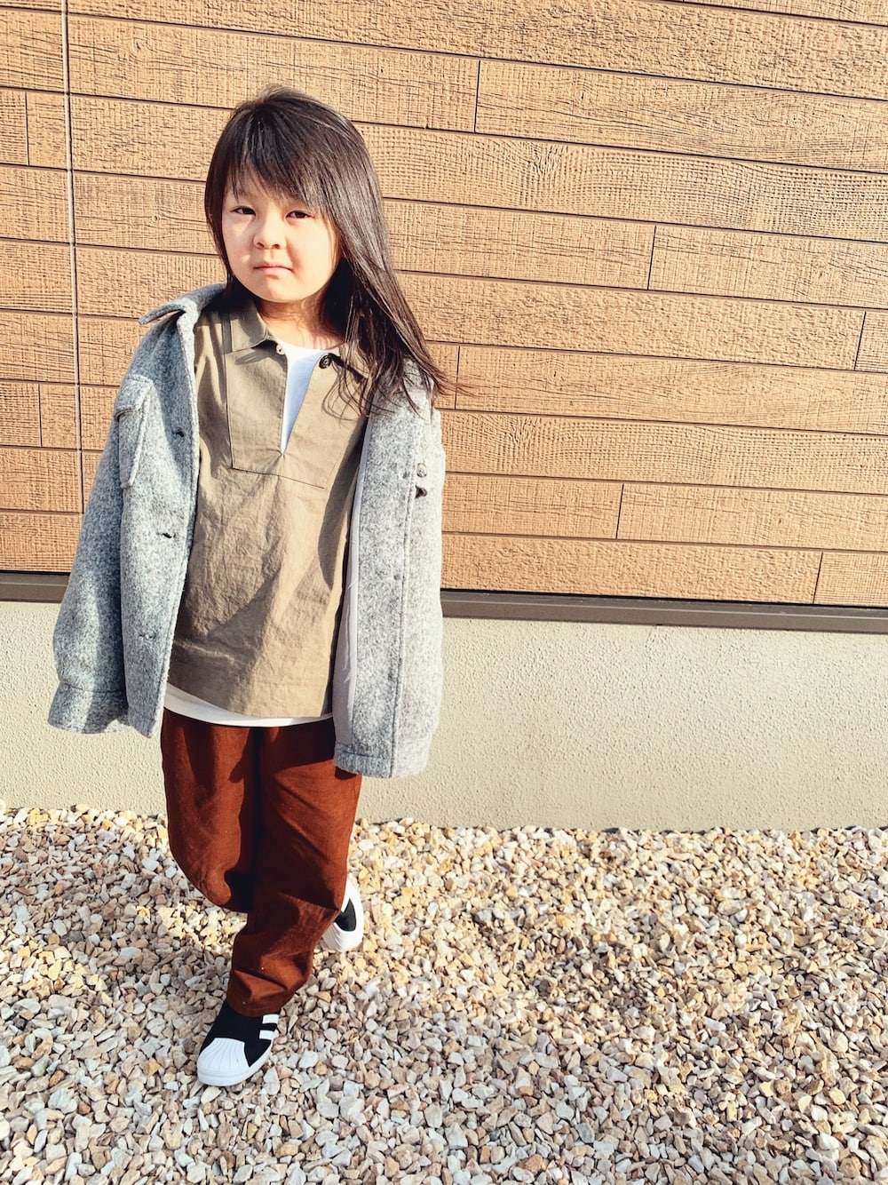 ・ チノパンとスニーカーを着回してみた ⸝⋆ 夕陽で顔が険しい娘ちゃん😂 ・ 《身長125/体重25》 ・ 見ていただき ありがとうございます😊