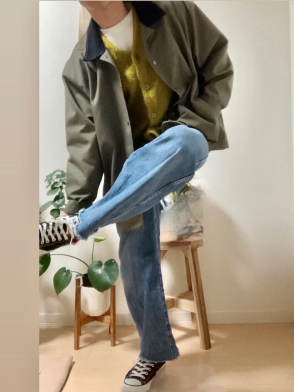 題名「あ、ここ土足禁止っす」 見えにくいですが、カーキとイエローの相性は意外と🙆♂️です!