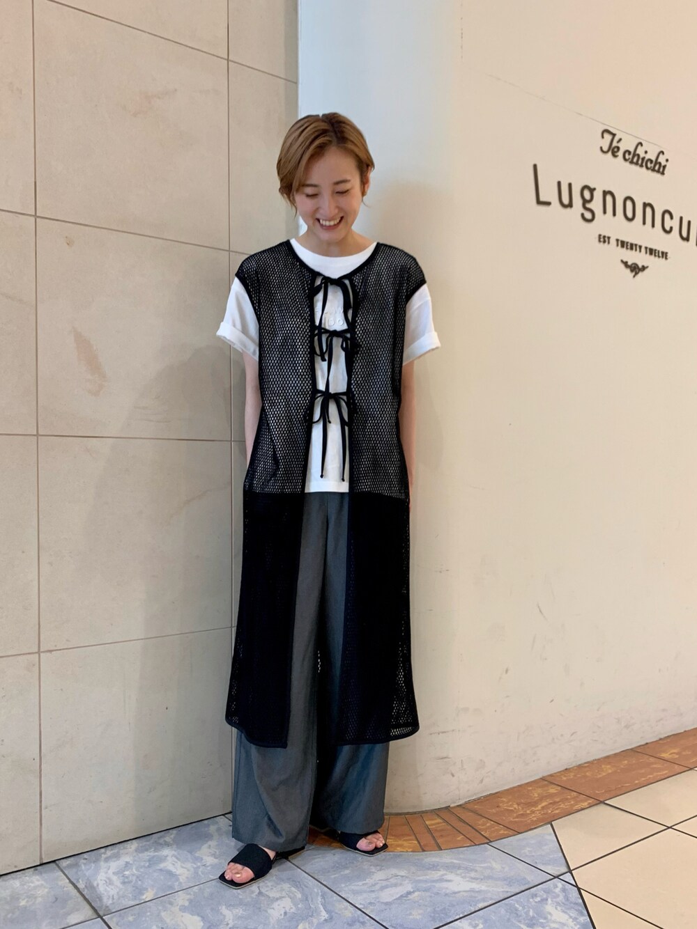 テチチテラスでカジュアルコーデです🙋♂️ メッシュジレは前後2way仕様です🤍 リボンを結ばずにたらしても可愛いです☺️ ワイドパンツ×ロゴTのシンプルなコーデに 合わせるだけでトレンド感が出ておすすめです!