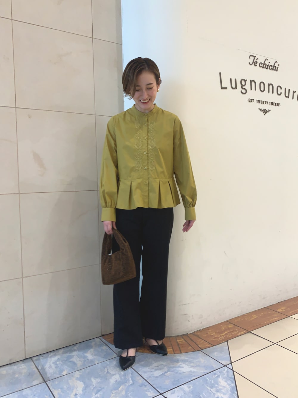 こんにちは🙌🏻 テチチで綺麗めコーデです☺️ 胸元の刺繍とペプラムデザインが可愛いブラウス💚 落ち着いた秋色なので挑戦しやすいと思います! スリットパンツと合わせてスッキリした コーデにしました◎