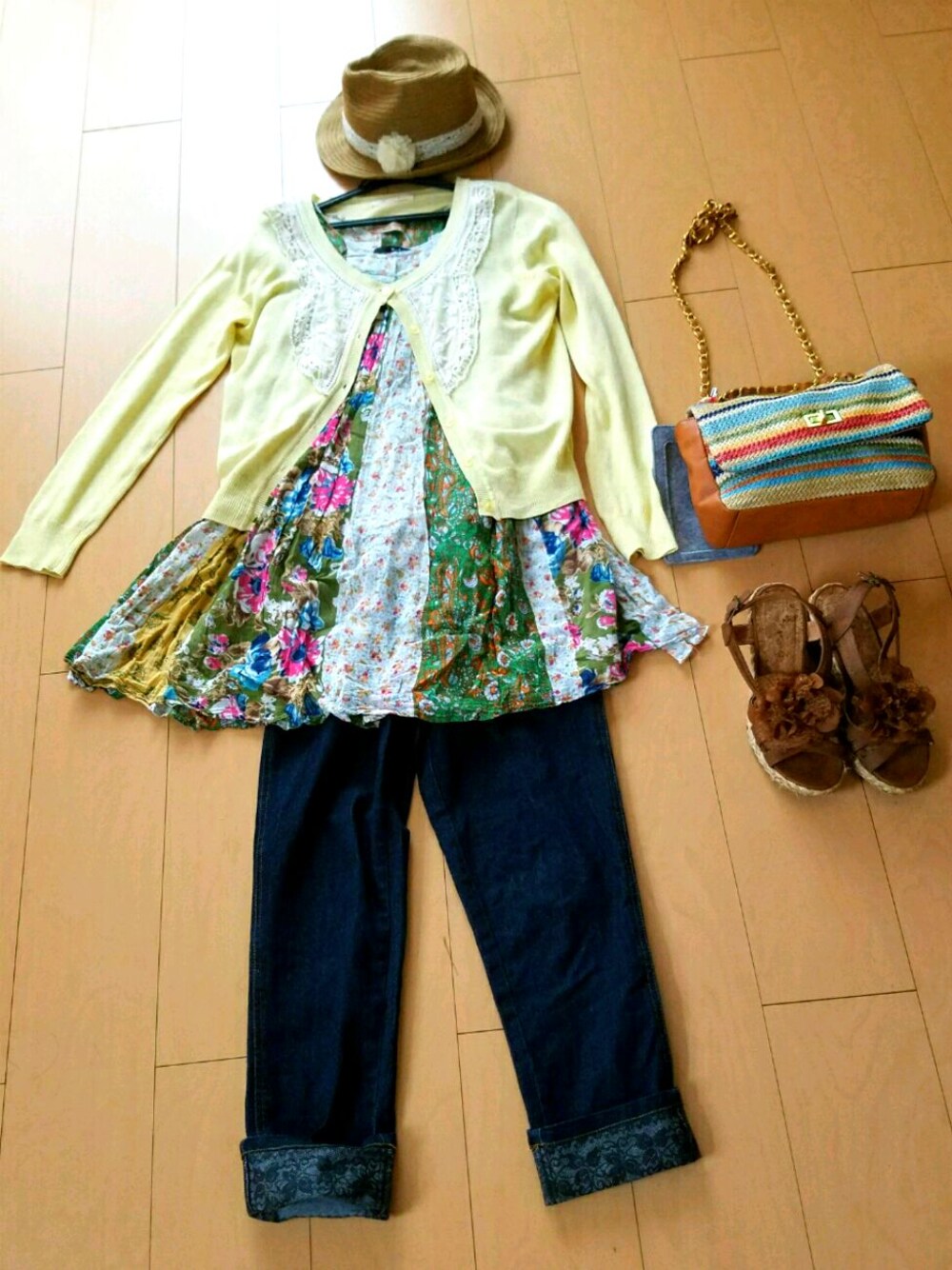 産休5日目~🌼*゜ 今日は 大雨らしいですね😣⚡💦 外出時は 気を付けましょー✋💦 今日は 高校時代の友人とランチへ~🍴✨ これまた久しぶりに会う子なので とっても楽しみ!!😆🎶 産休を 満喫しております✋⤴ コーデは… 昨日に引き続き~ 今日も エスニック調のワンピ👗💕 これも 古着屋さんで 一目惚れして 即買いし 毎年 夏に 着る回数が 1,2位を争うんじゃないかってくらい お気に入り⭐+゜ そして イエローガーデは パステルカラーで いろんなコーデに合わせやすく レースもついてて めっちゃ愛用してます♥*゜ デニムパンツ👖は サイズは 普通にMなのですが ウエスト部分が ゴムなので 妊婦になってからも 全然履けて 折り返しの柄がお気に入りで これまた 最近 ヘビロテしてるアイテムです👍⤴