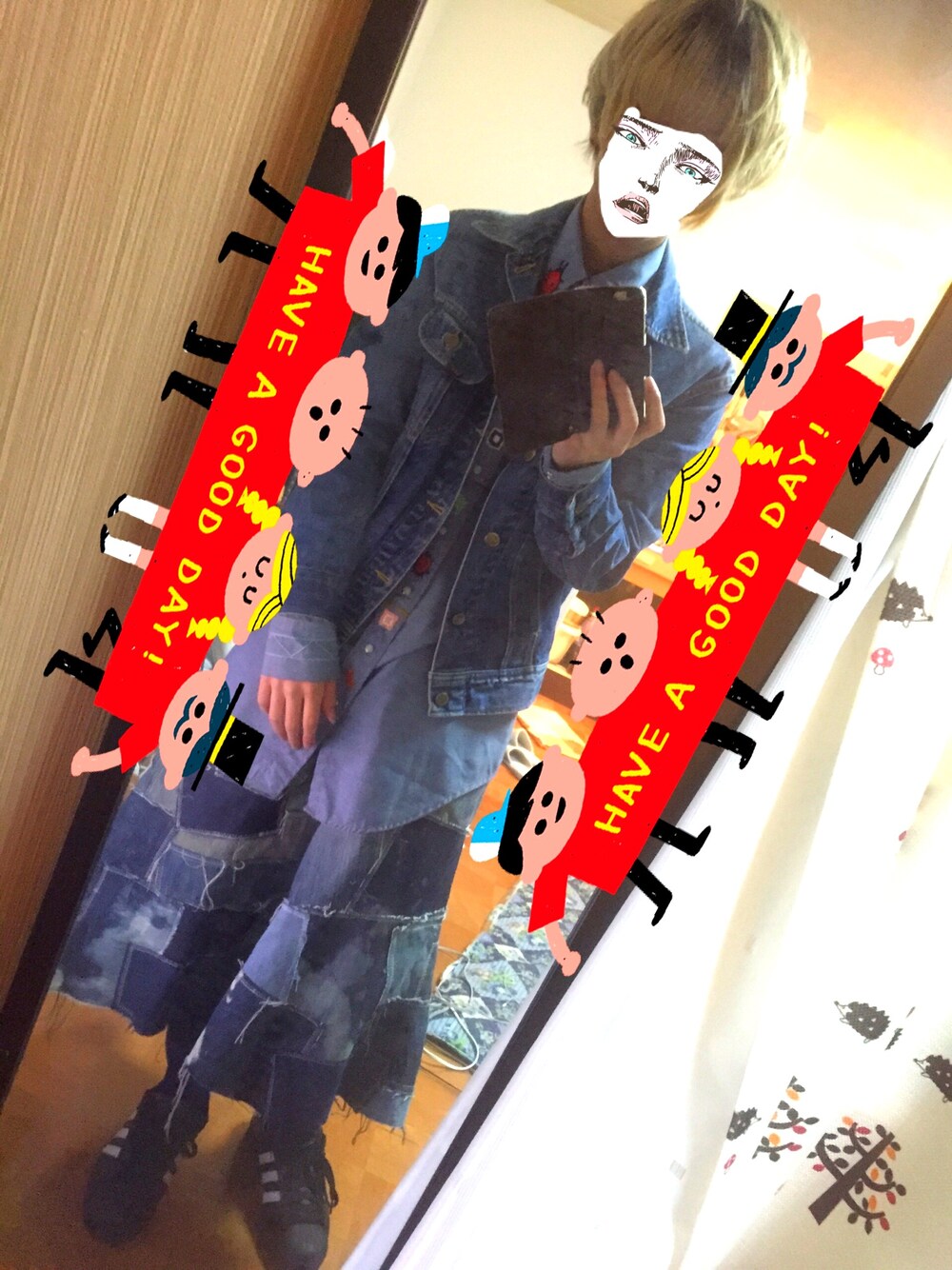 10月頃の格好です!デニデニコーデです‼︎ 下に着てるシャツには虫が沢山います。 虫嫌いな友達に虫沢山連れてくるな言われます笑 時計のネックレスしてるけど見えない…