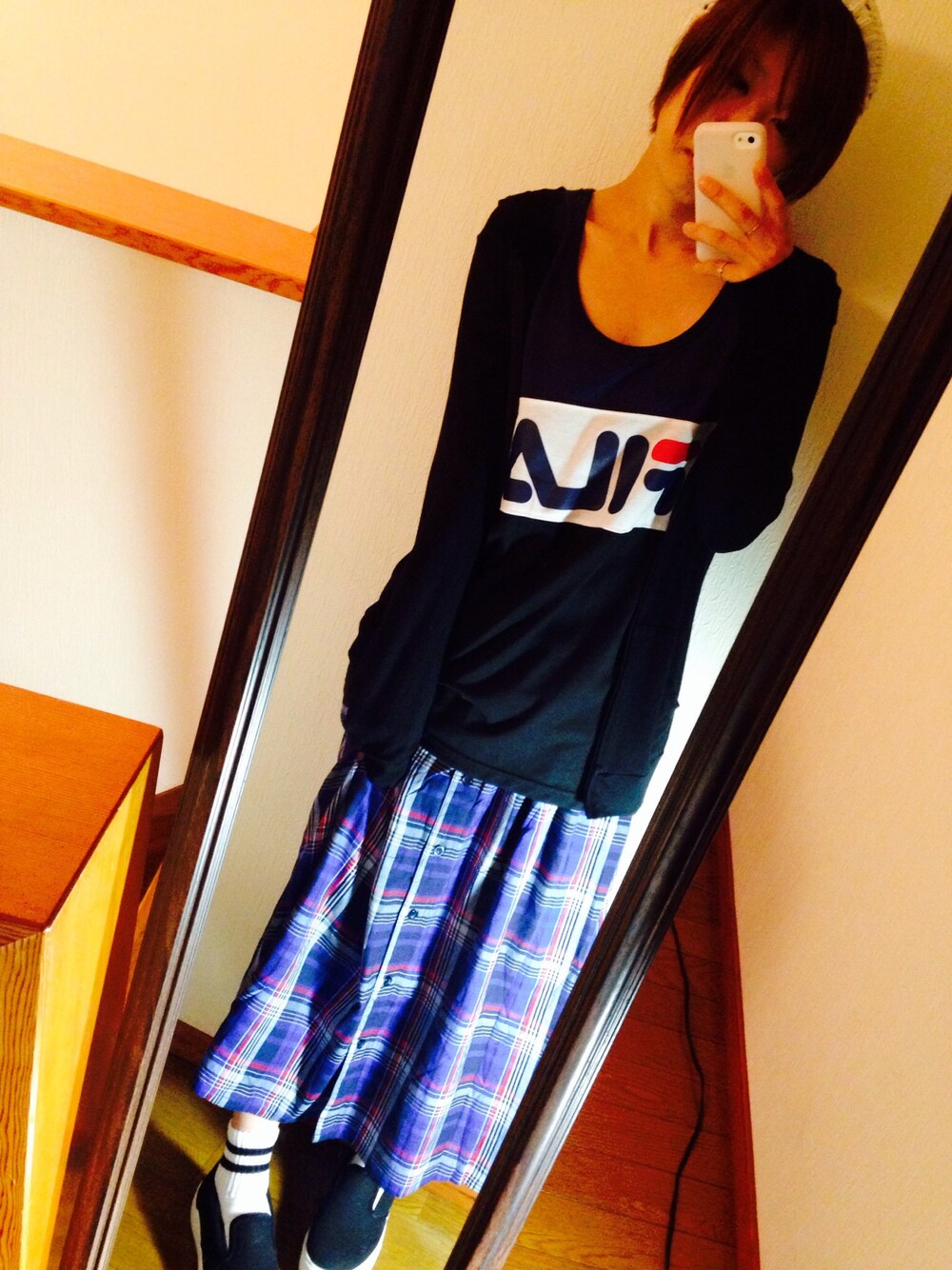 かたじゅんのスカート「肩紐付きチェックロングスカート」を使ったコーディネート