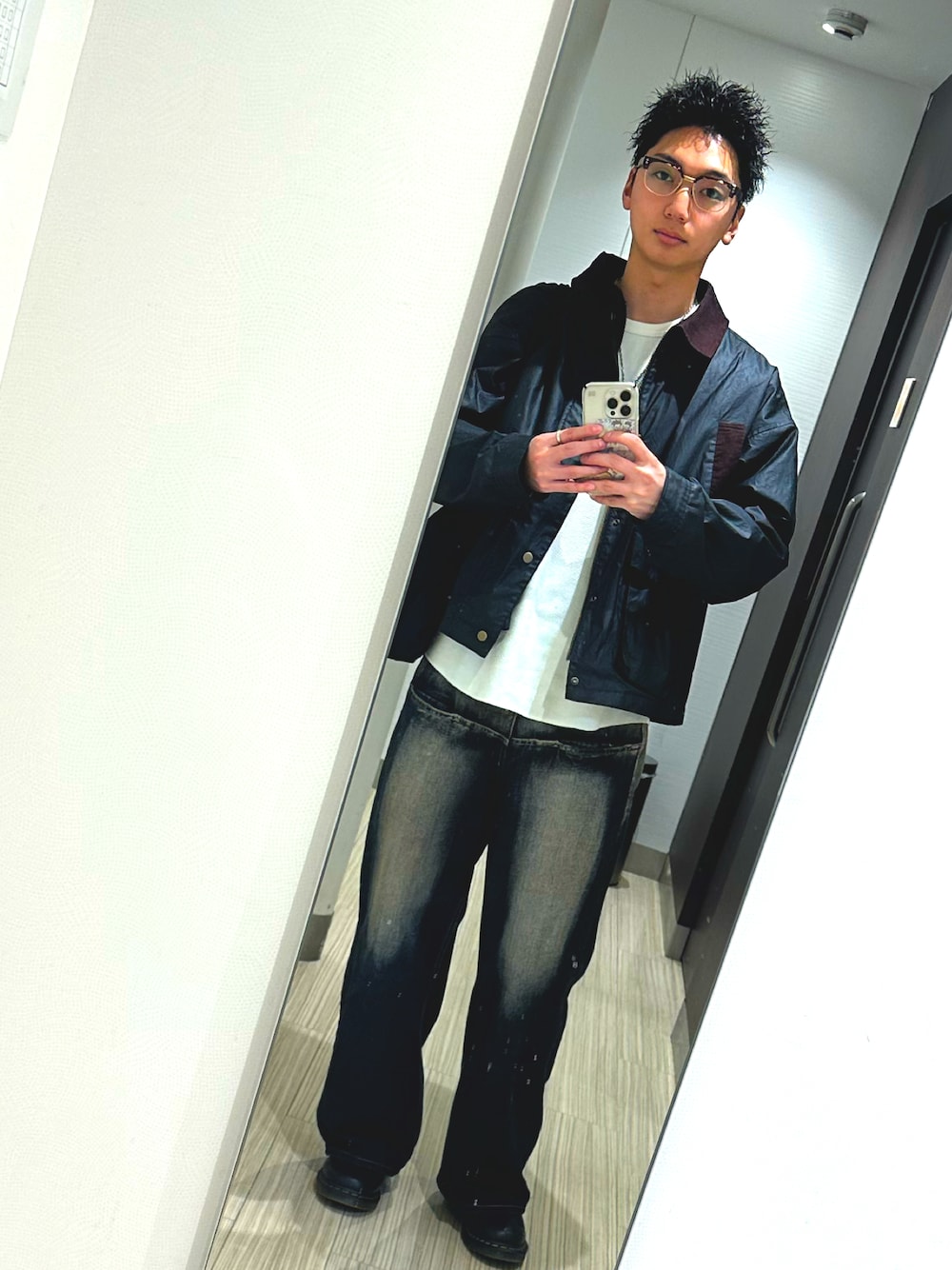 ハンティングジャケットとワイドデニムのコーデになってます 靴はスニーカーではなくレザー系のものを使用しデニムも明るすぎない色でコーデにまとまりを出すような感じをイメージしています。 中に着るトップスは派手にはせずシンプルで勝負です🔥