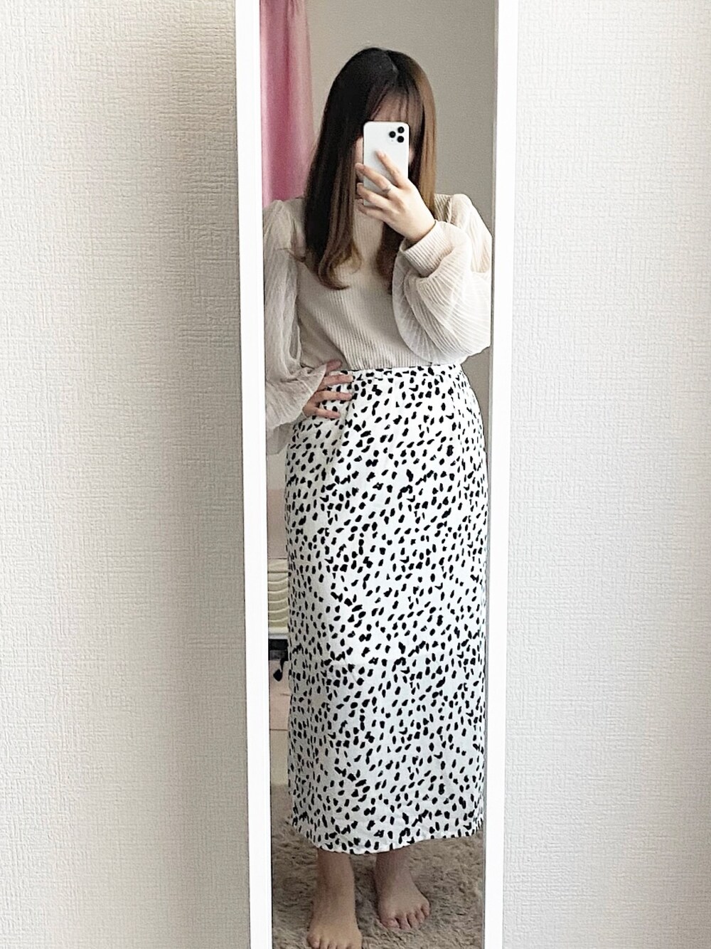 ダルメシアン柄ロングスカートが形がタイプでお気に入り💓トップスの袖のボリューム感も良き🕺