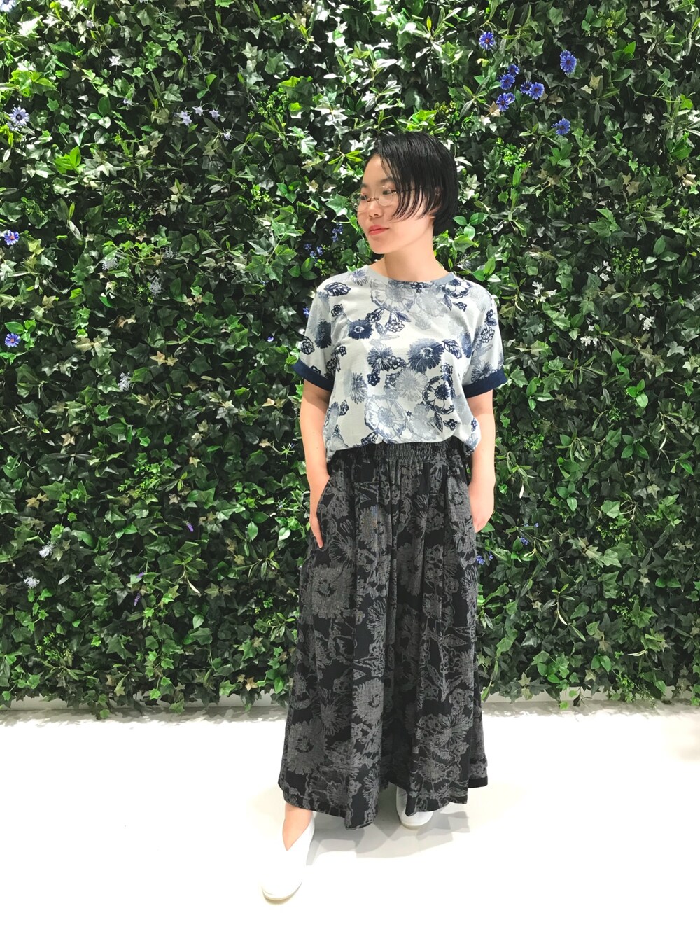 涼しげな花柄が素敵な、上下同じ柄合わせのコーディネート。 異素材でも統一感を演出してくれます。 スカート見えする柔らかい素材のワイドパンツで楽チンながらも華やかな印象に。 インディゴ染めのTシャツは一枚で着ても見栄えする、夏のお助けアイテム。 袖ロールアップで藍を見せて。