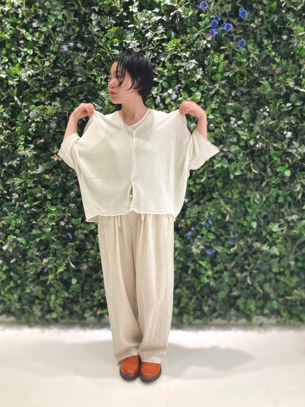 ミルキーカラーでまとめたコーディネート。 上下共ズルッとした落ち感のある素材・ゆるゆるシルエットでこなれた雰囲気に。 カーディガンの前を閉じてニットトップスとして。ボタンの並びのリズムとVネックがちょっとしたポイントに。 足元はパンツをルーズに弛ませて。革靴がカジュアルの中にもきちんと感をプラスしてくれます。