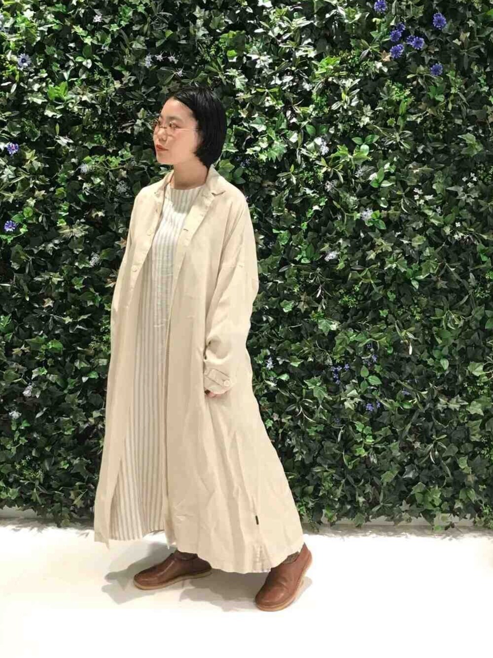 テンセルバーバリー生地のコートはドレープ感が素敵。 楽チンガーゼのワンピースも、これを上に羽織ればおでかけらしくなります。