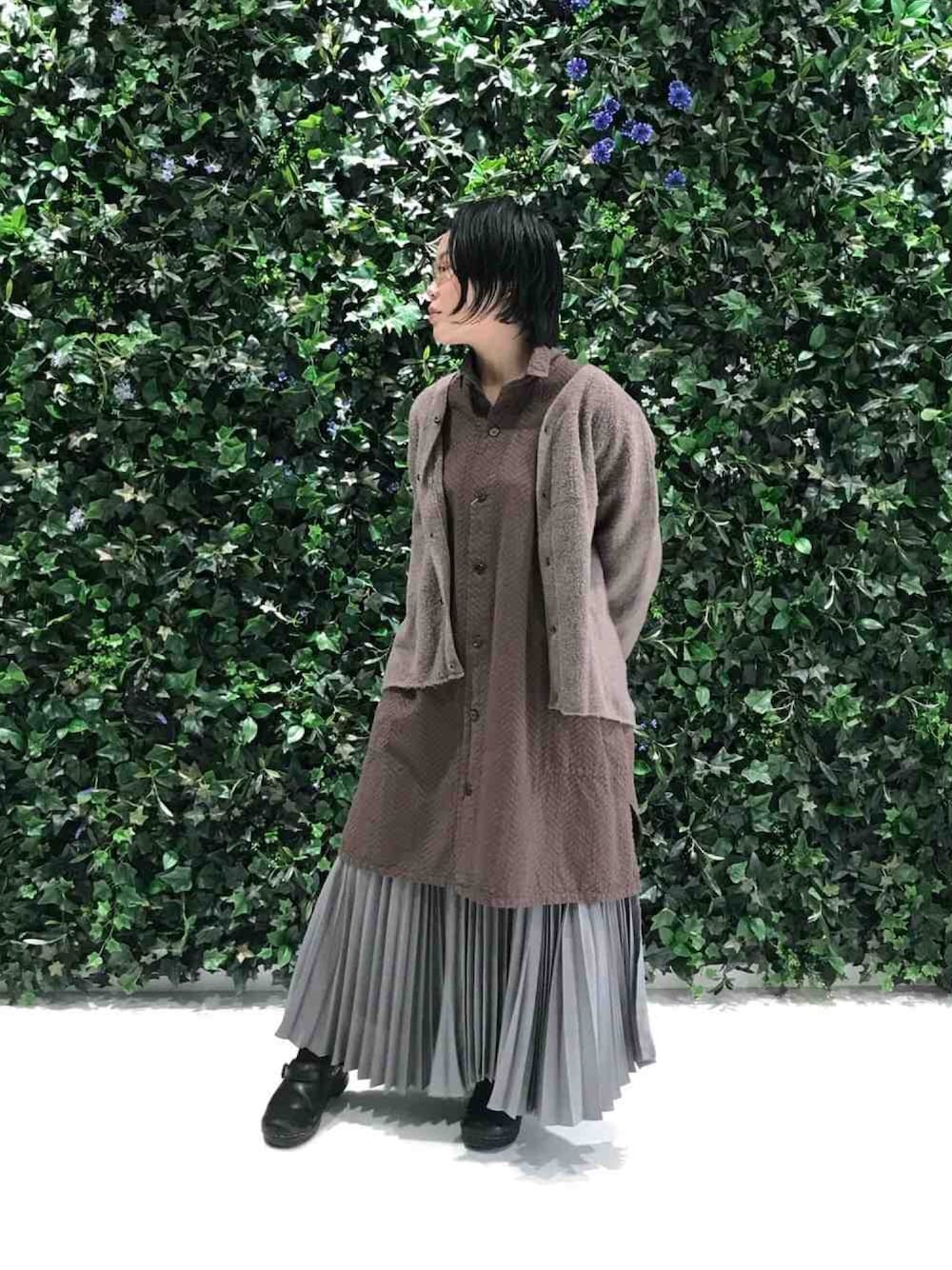 ココアブラウンが素敵なコーディネート。 渋めの色味ですが、プリーツスカートが上品な若々しさをプラスしてくれます。 ヘリンボン柄の入ったチュニックシャツもジャガード織なので暖かみがあります。