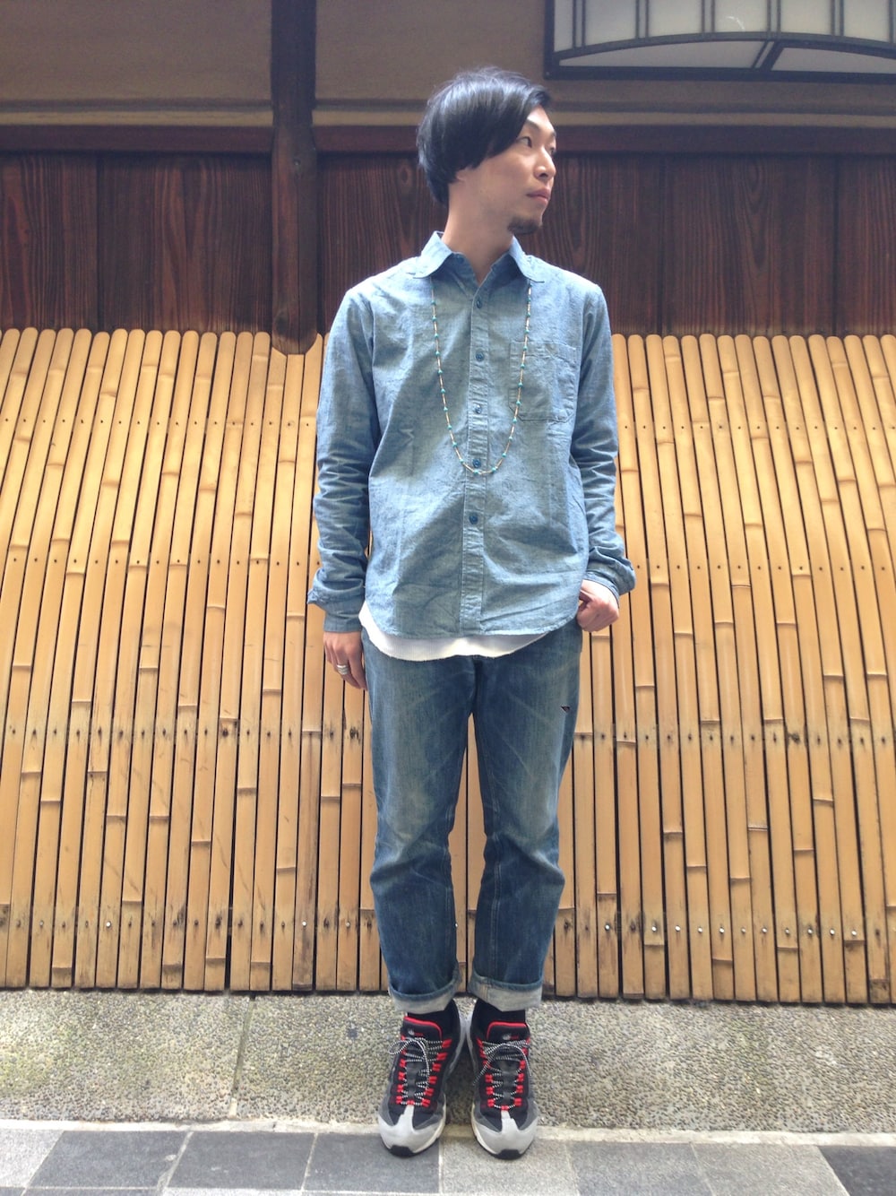 シャツ:【NECESSARY of UNNECESSARY】 デニム:【HELMUT LANG】 ネックレス:WHO'S WHO gallery