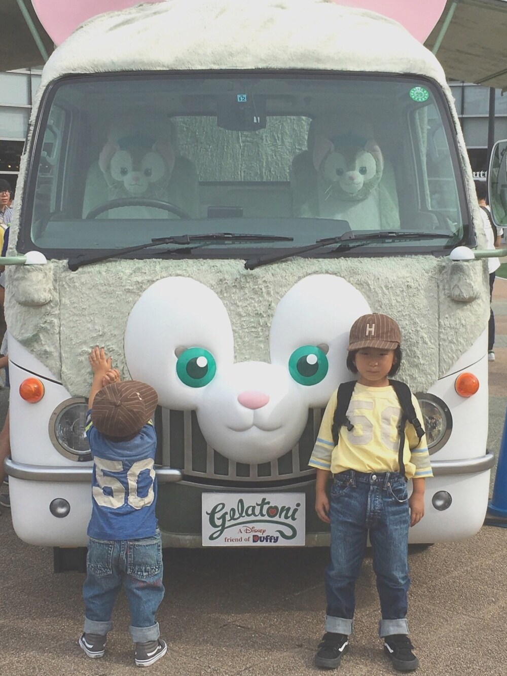 またまた載せ忘れてた 先週末のコーデ。 久々のアメカジ姉弟。 近くのSCに遊びに行ったら ジェラトーニのワゴン🚍がいて かわいくてパチリ。