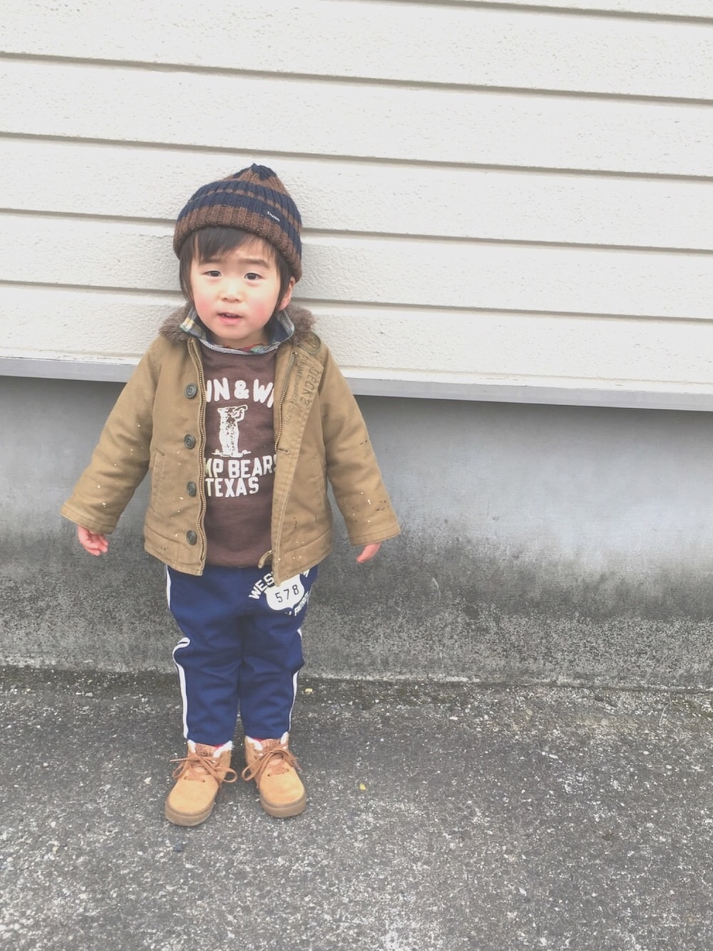 ラインパンツ♡ 重ねて重ねてかなり好きなコーデ♡ VANSのHALF CABは息子サイズだけ残っててポチっと。 中がボアでポテっとしたちっこいVANSたまりません♡ ただ、紐やし履かせるんがめんどいw
