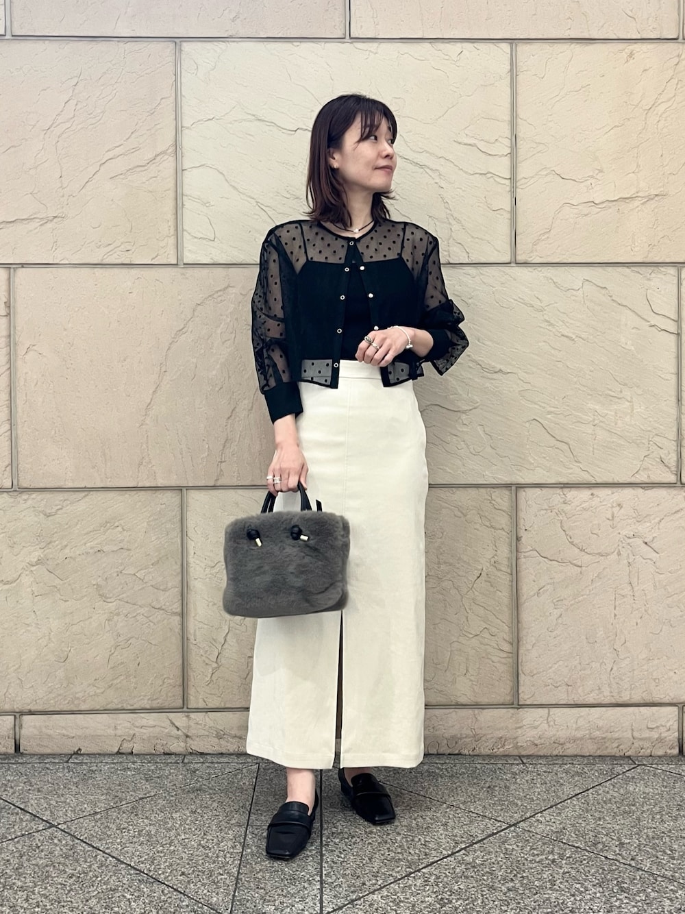 【カーディガン】 肌あたりもよく、程よいゆったり感です。長袖のカットソーやコンパクトなニットも合わせて頂けます◎ 【スカート】 とってもストレッチが効いたタイトスカート。フロントのスリットが大人感あり!スウェードライクなのでデニムシャツやカジュアルTとも合いそうです。