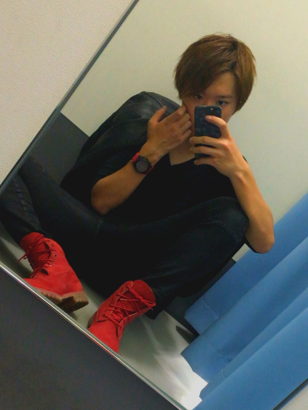 ブラックコーデにワンポイントで赤ティンバー(^-^)