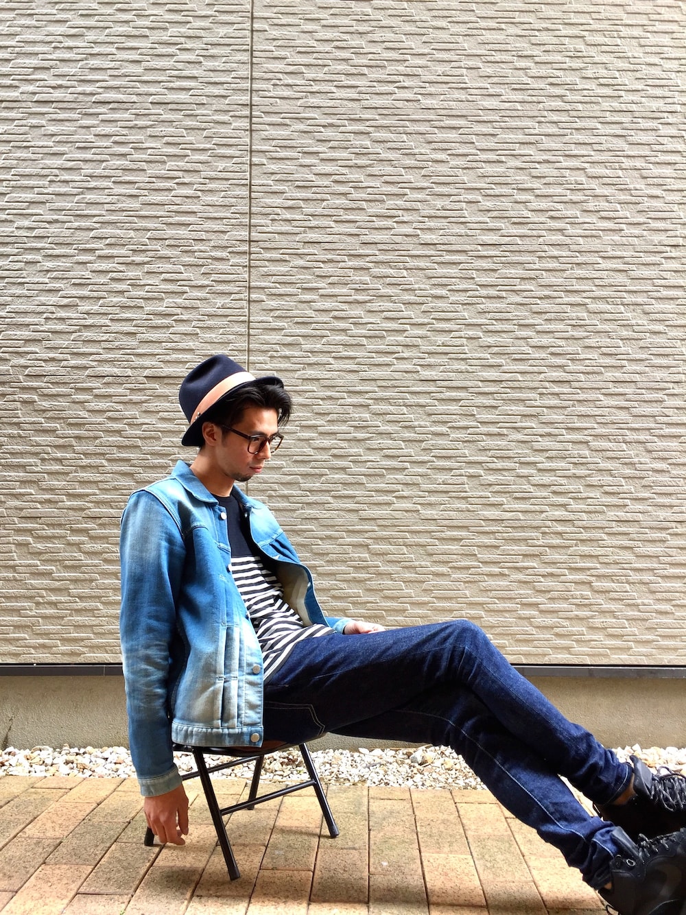 明るめのデニムジャケット、春です。 たまには座って。