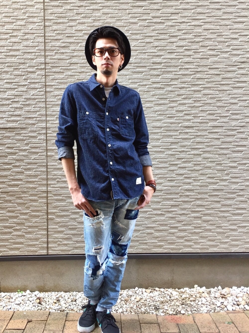 がっつりリメイクの入ったデニムパンツ。 シャツは綿麻でサラッと。