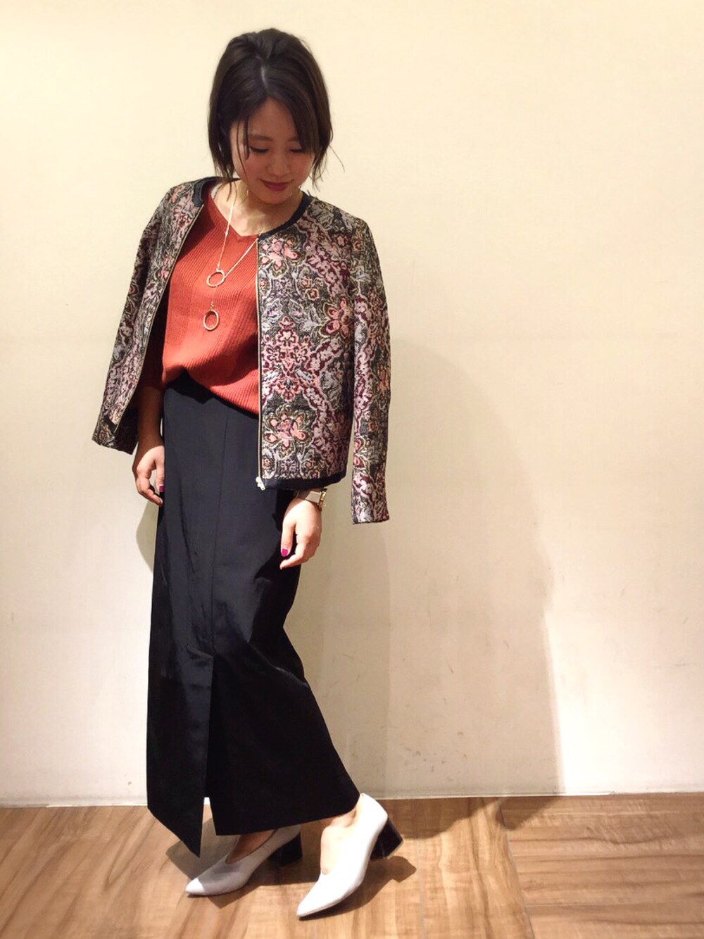 ゴブラン織り、ロングタイトスカート、、トレンド感満載コーデです🙆💓