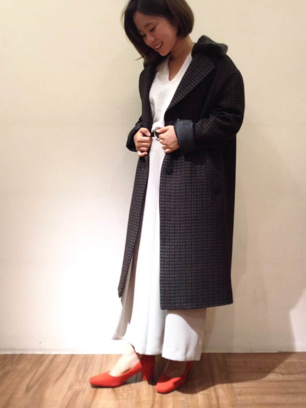 流行のチェック柄コート😋 一枚で主役になるので、 インスタイルはあえてワントーンで🎶