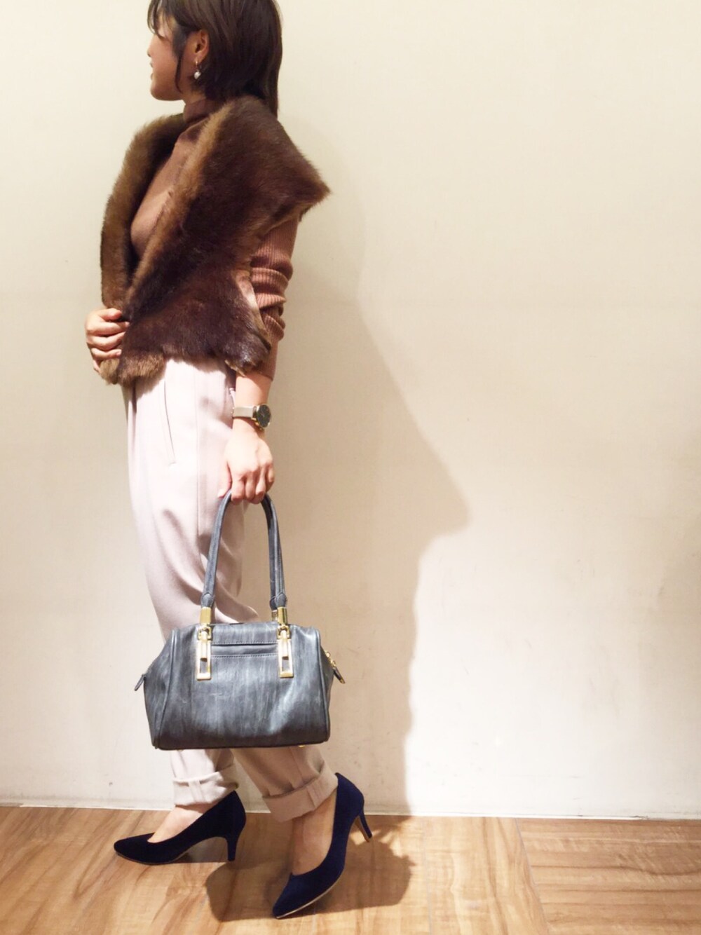 茶系のワントーンでまとめたコーディネート✨ パンツはストレッチが効いていて、なおかつ裏起毛なので暖かく履いていただけます😆
