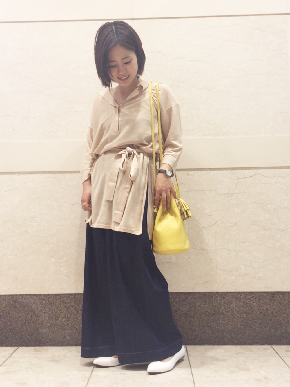 デニムのワイドパンツは私でもフラットシューズを合わせられる嬉しい着丈😆💗 ゆるゆるコーデでです👌