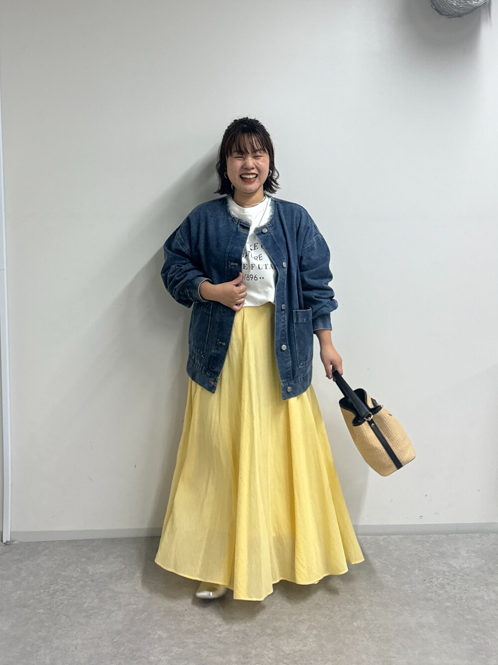 chia(La boutique BonBon official)のデニムジャケット「《季節の変わり目に◎》ノーカラーオーバーデニムジャケット」を使ったコーディネート