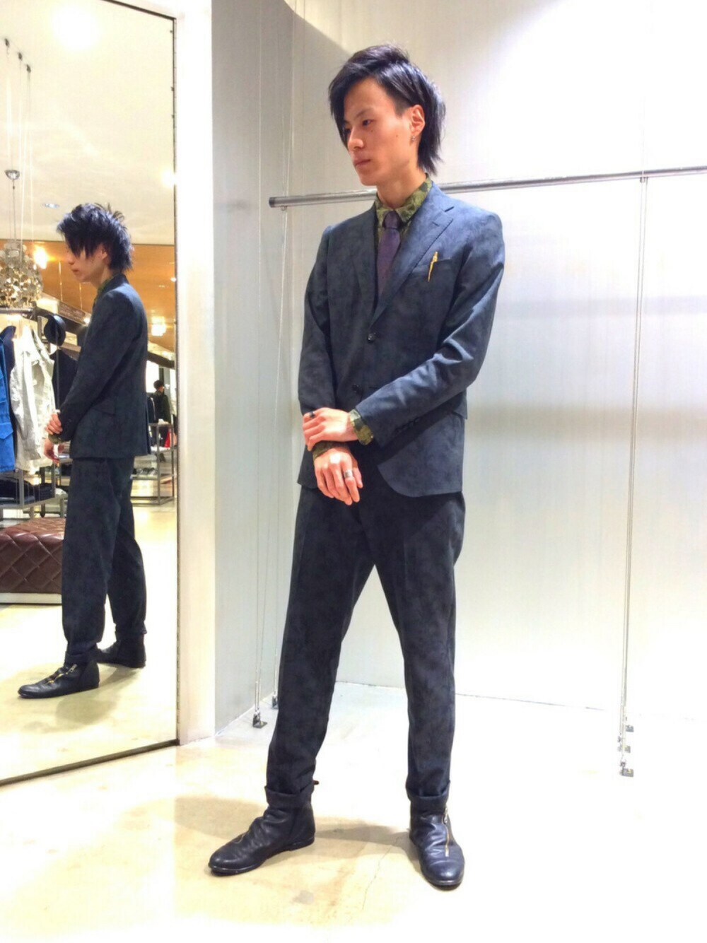 本日は全て私物で柄物同士でコーディネートしました。セットアップはボタニカル柄で、春を感じさせる様な仕上がりになっております。勿論、ジャケットは背抜きで仕上げてある為これからの季節に活躍してくれます。インナーの柄シャツはブルーとの2色展開ですが、私は迷う事なく2色買いしました。ネクタイも見る角度によって色の変わる個性的なアイテムとなっております。