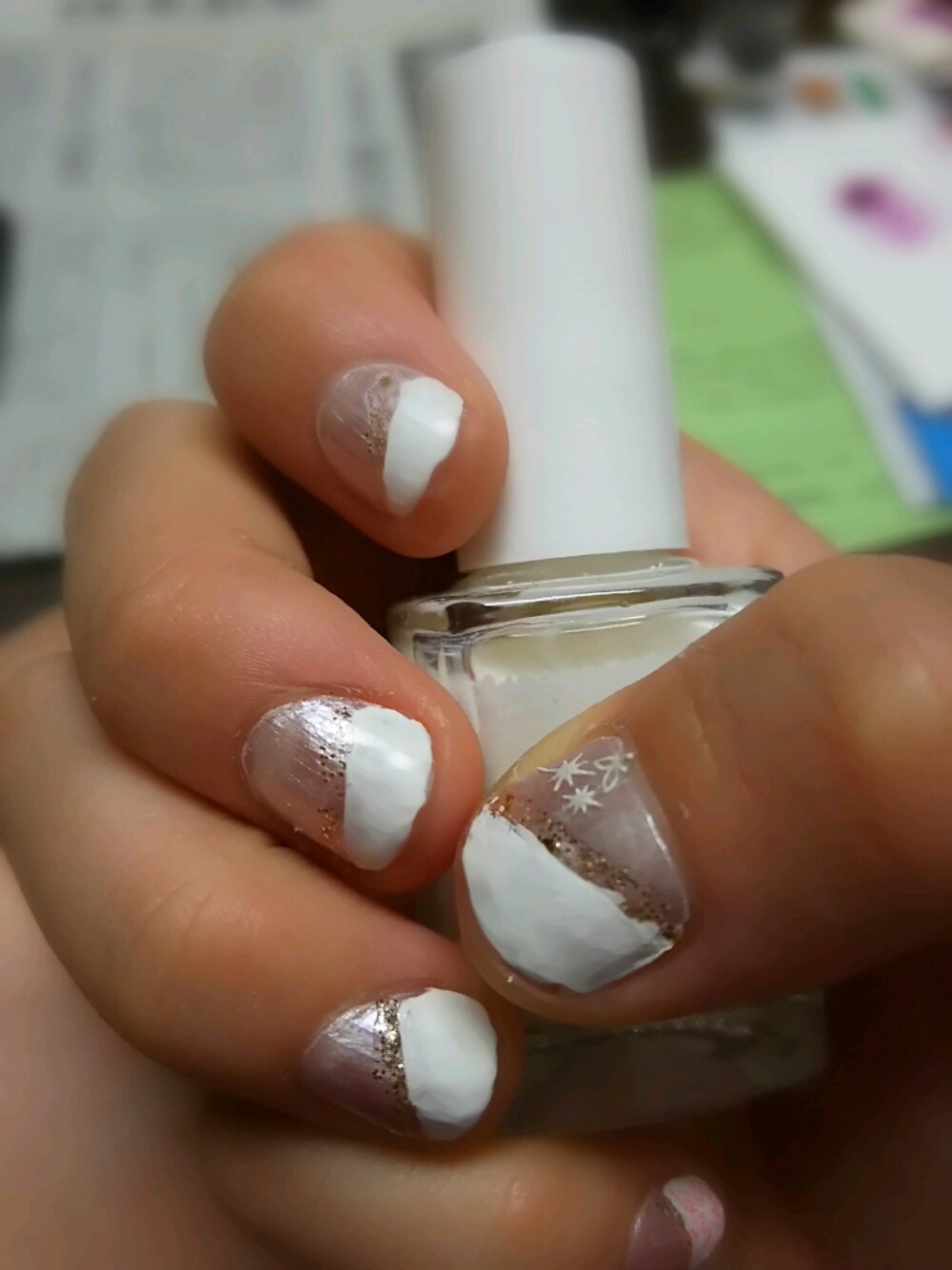 斜めフレンチネイルしてみました! もちょっと器用になりたい…! ベースの薄ピンク:マジョリカ・マジョルカ 水ネイル 白:CANMAKE ラインのラメ:100均