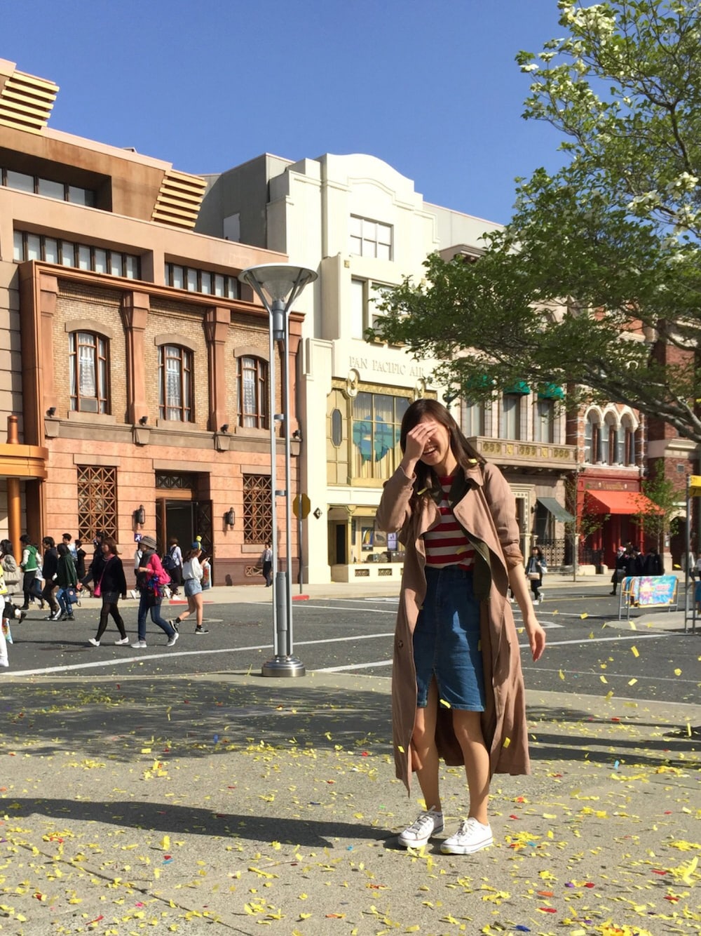 友達とお揃いでボーダーのTシャツ❤️ カジュアルにデニムスカートを合わせて 寒さ防止にロングトレンチ❤️ その下には、暑かったらすぐにトレンチが 脱げるように♡︎(°´ ˘ `°)/ MA-1のカーキをきてます❤️