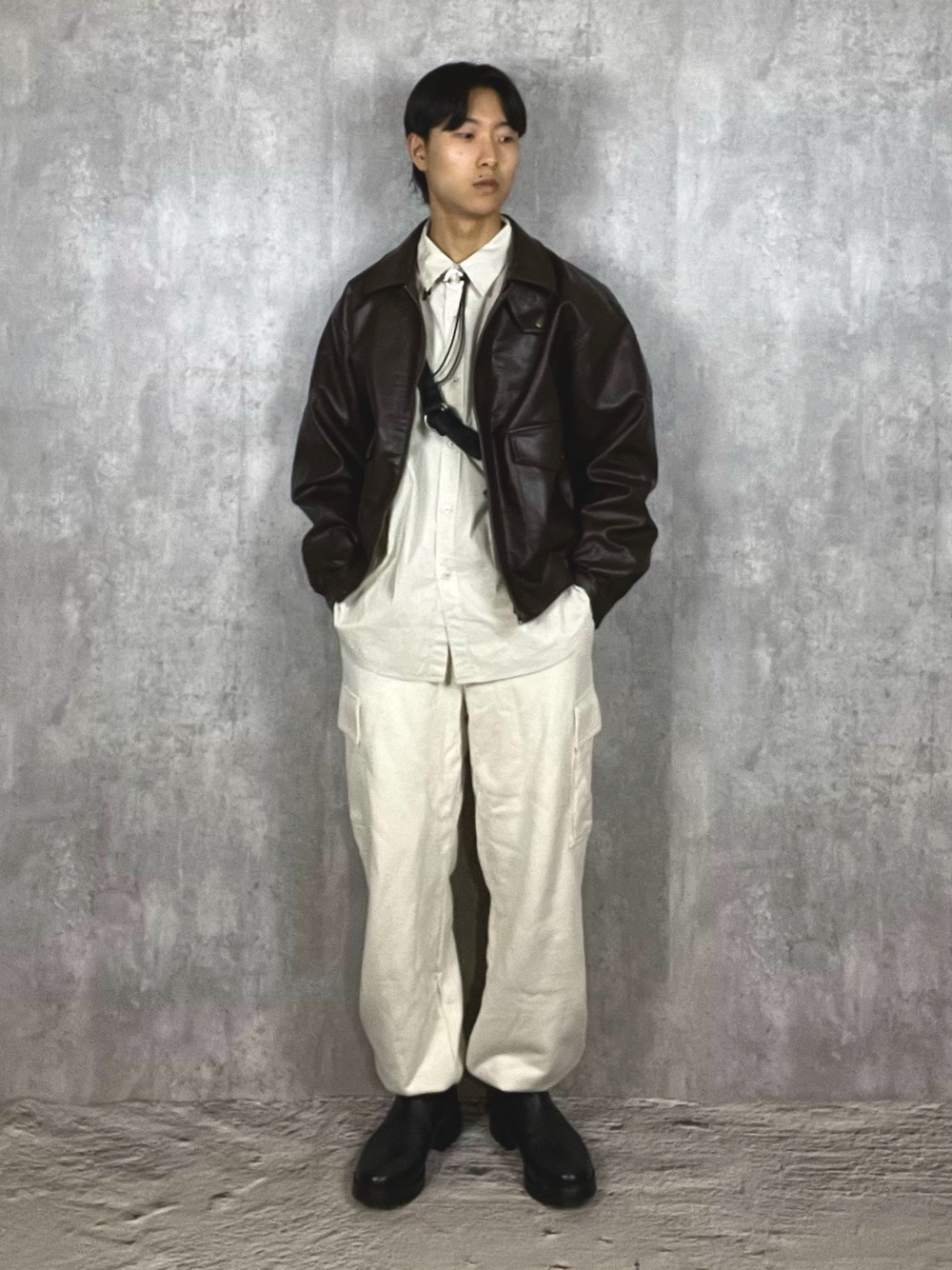 【スウェット×レザーで甘辛コーデ】 UNIQLOのスウェットカーゴパンツにレザージャケット、シャツ、ブーツを合わせた甘辛ミックスコーデです! パンツとシャツを白系で合わせて清潔感があり縦長にスタイルよく見えるようにしています。 ジャケットとブーツは黒やブラウンのレザーで引き締めバランスをとっています。 ネックレスとショルダーバッグでアクセントを加え、シンプルすぎない印象にしました! いつも❤️いいね➕お気に入り、素敵なフォルダインありがとうございます。とても励みになっています! Instagramもやっています! 是非フォローお願いします!🙇