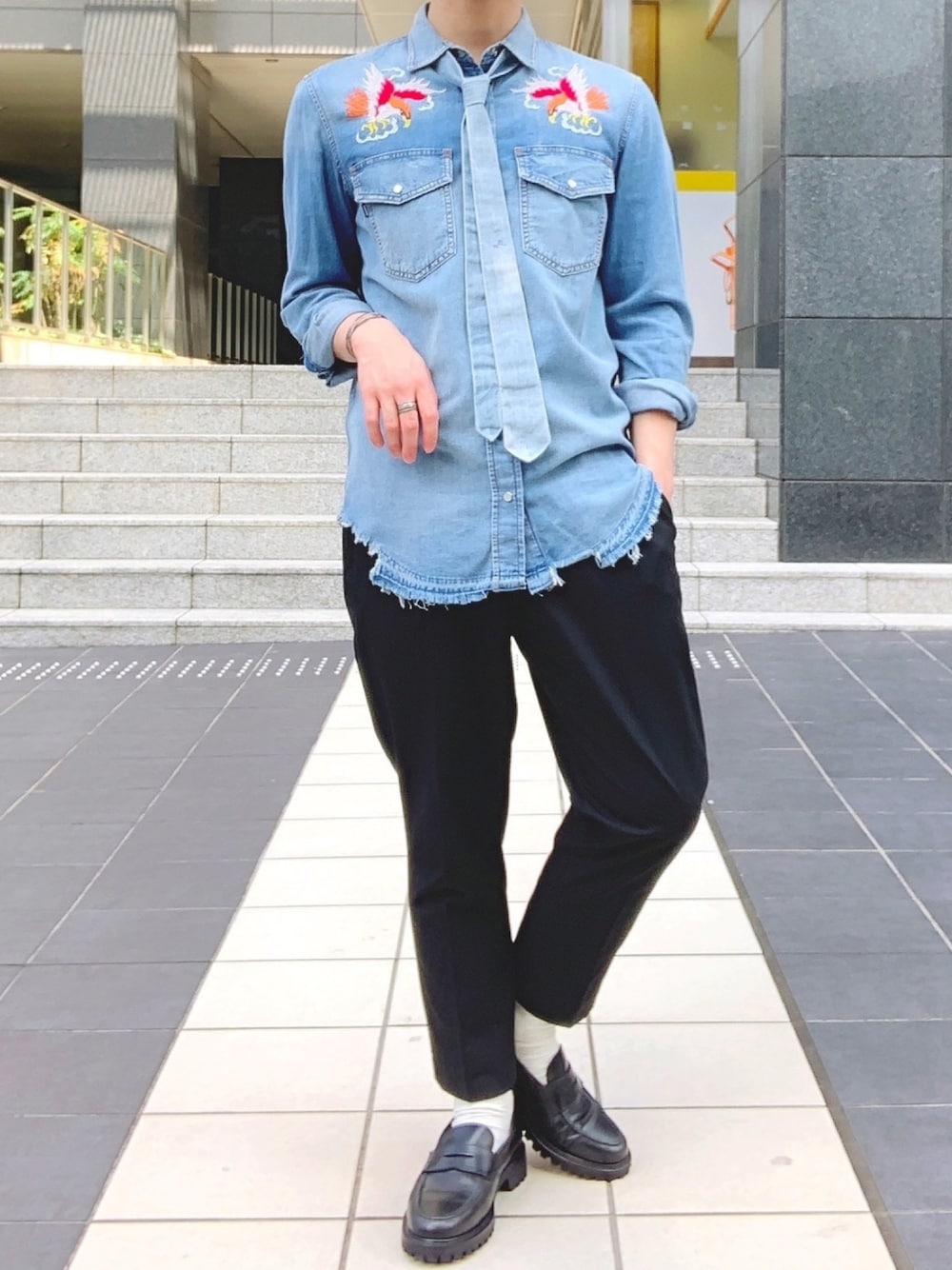 デニムシャツ✖️デニムネクタイ DIESELの刺繍アイテムが大好きで、他にもいろいろ持っています! 暑くなってきたので、そろそろ半袖の出番かなー🤔